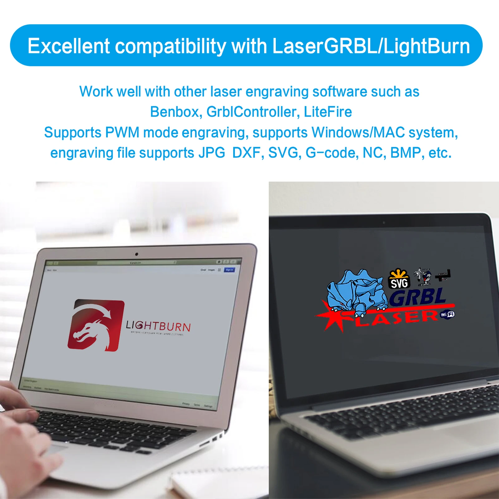 5. Широкая совместимость: машина совместима с различными зрелыми гравировальными программами, такими как LaserGRBL, LightBurn, Benbox, GrblController, LiteFire, поддержка гравировки в режиме s PWM, поддержка системы Windows, MAC system (LightBurn) и формат гравировки файлов поддерживают JPG, PNG, DXF, SVG, g-код, NC, BMP и т. Д.