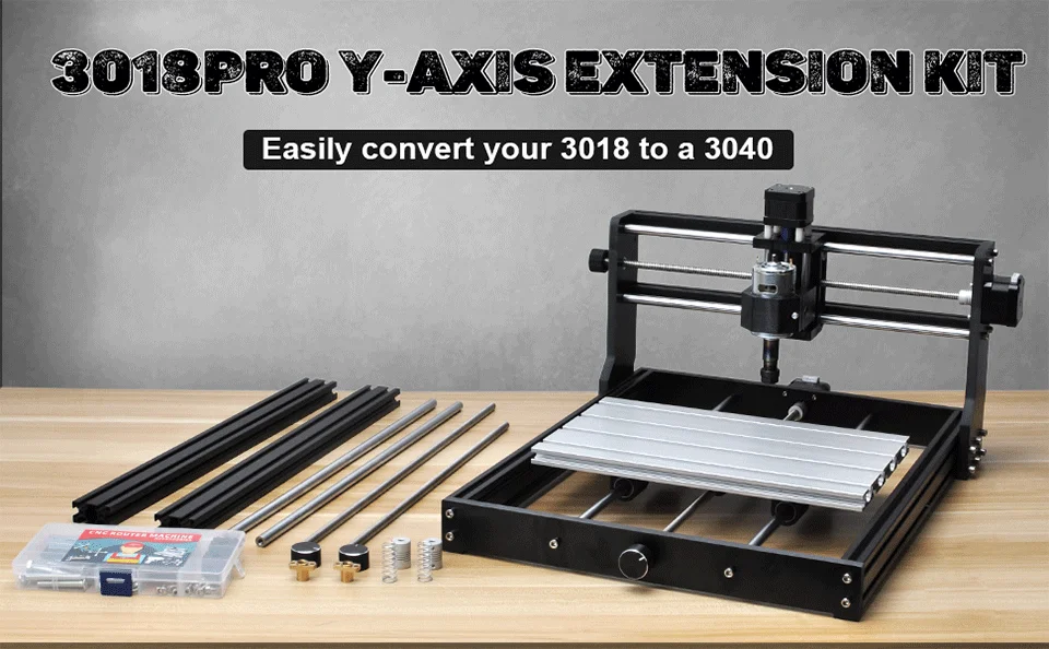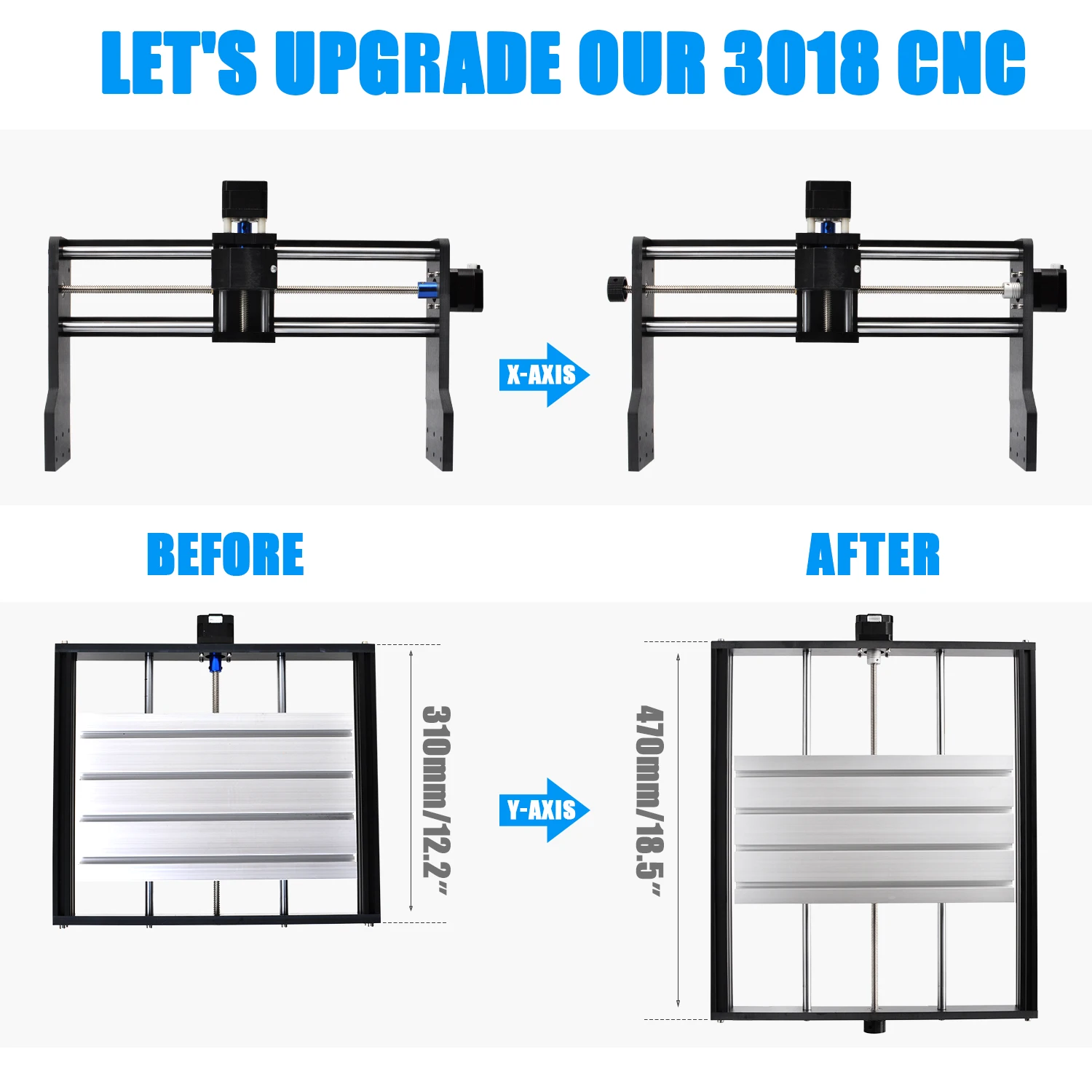 Заменив Удлинительный набор, вы можете быстро обновить и расширить потенциал своего 3018 CNC и расширить свою предыдущую рабочую площадь до 320*370 мм, что потрясающе! Это очень подходит для изготовления длинных бляшек, знаков или больших запасов материалов для нескольких порезов.