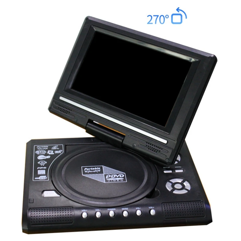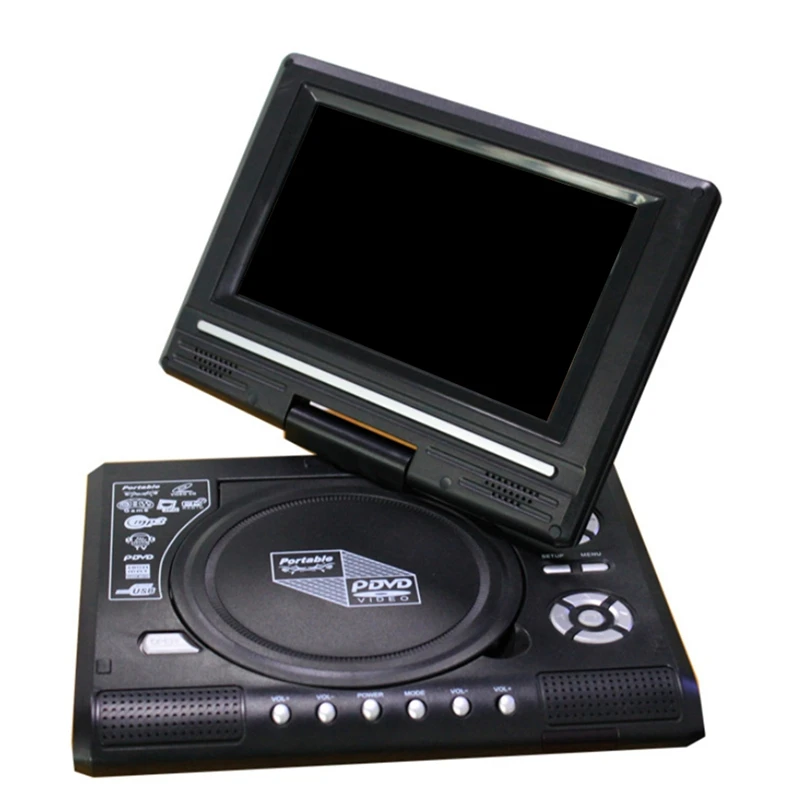 Полностью совместим с форматами AVI EVD, DVD, SVCD, VCD, CD, CD-R/RW и MPEG-4 и форматами изображений JPG. Полный код области DVD (диск не ограничен кодом области). И 7-дюймовый высокой четкости ЖК-дисплей дисплей 16:9 широкоэкранный, 270-градусов вращения подойдет к любому различные воспроизведения сред модель отлично пропускает воздух. ТВ функция. С интерфейсом сигнала кабельного телевидения, он может задавать сотни каналов, которые могут легко получать проводные и беспроводные ТВ-сигналы.