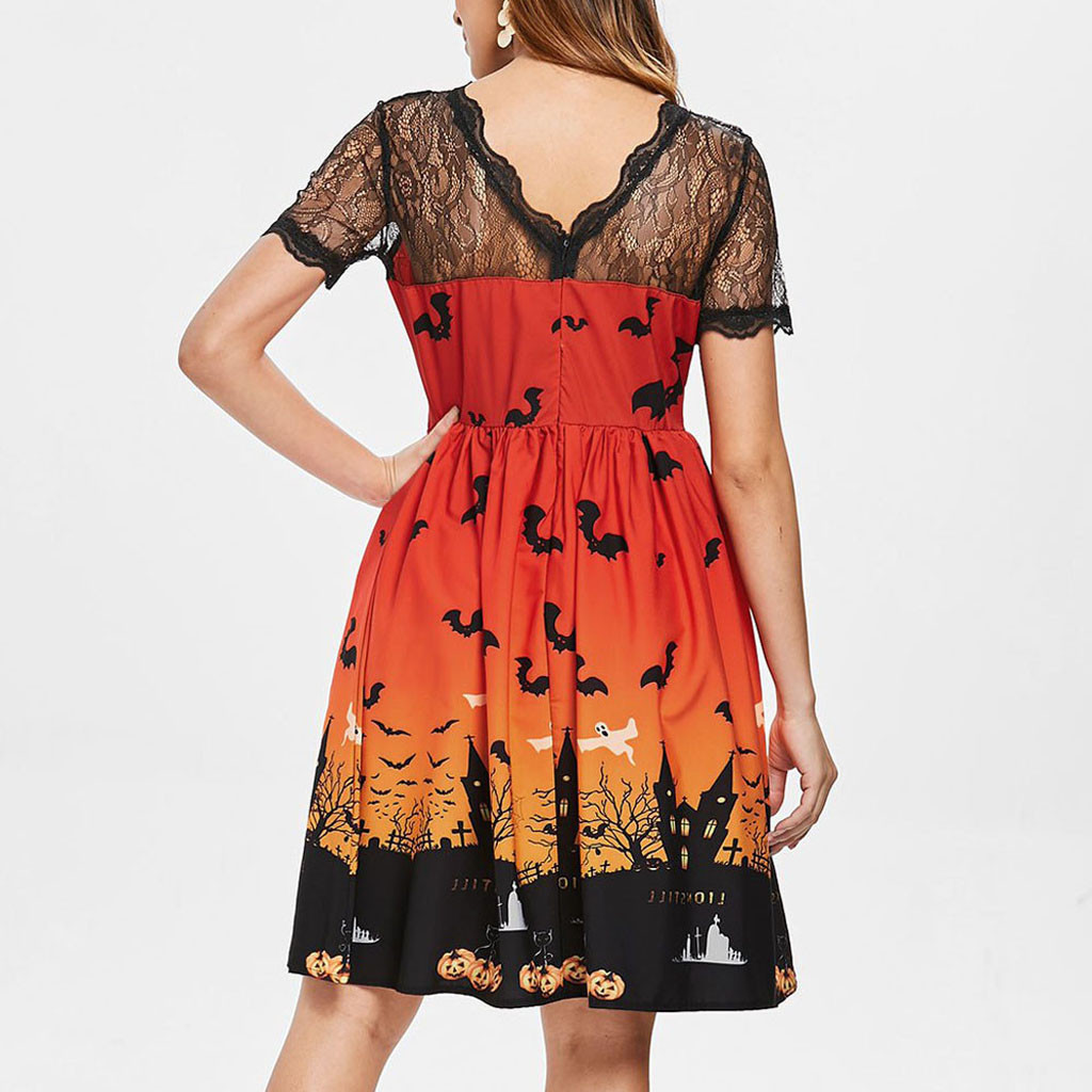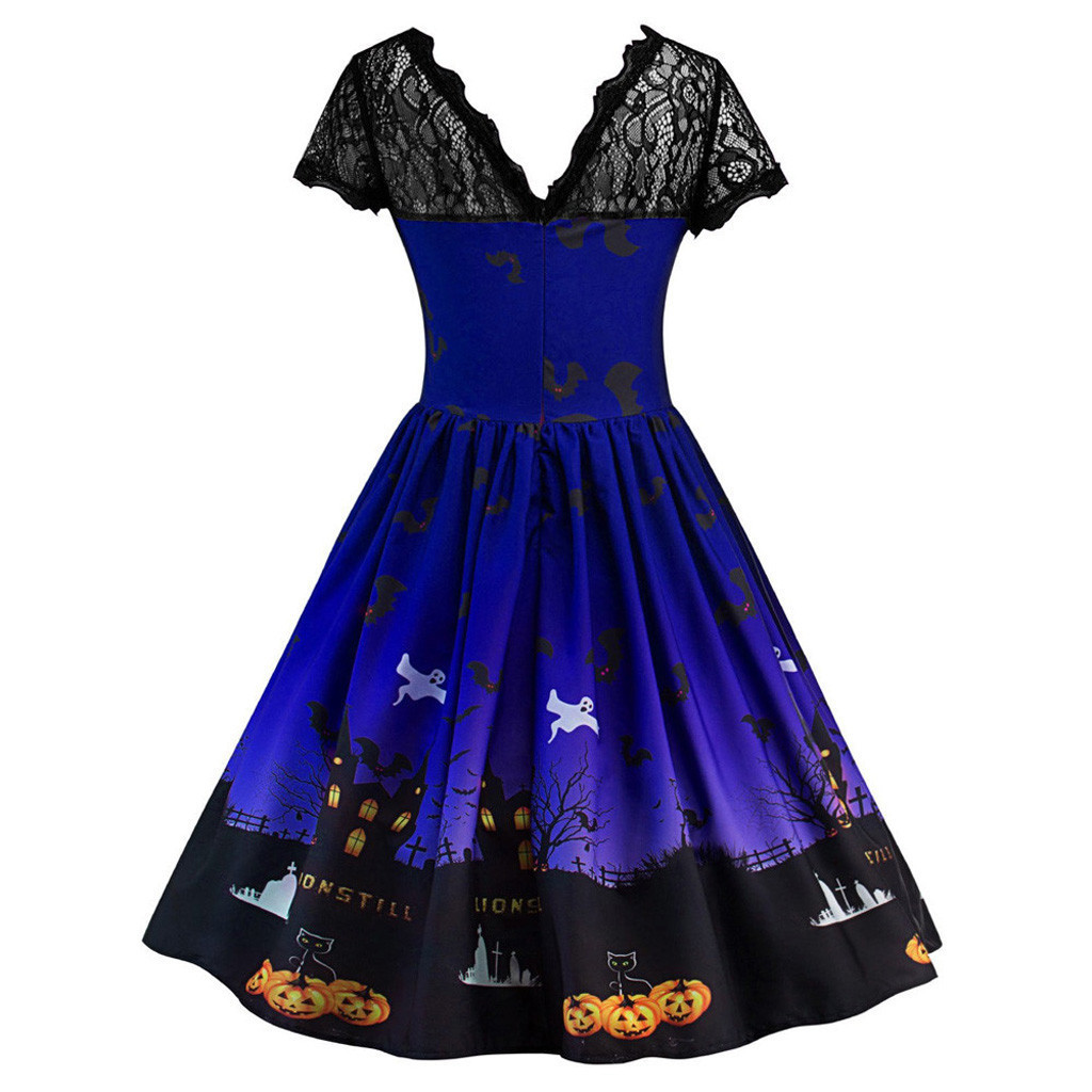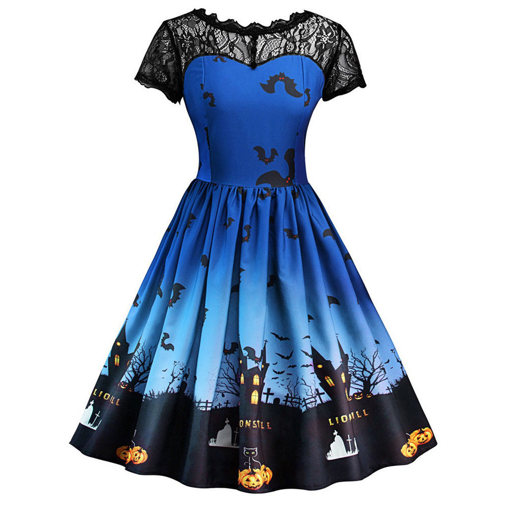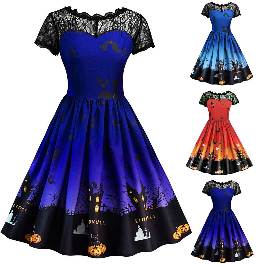 Модное винтажное вечернее кружевное платье с короткими рукавами и принтом на Хэллоуин; Вечерние платья для женщин