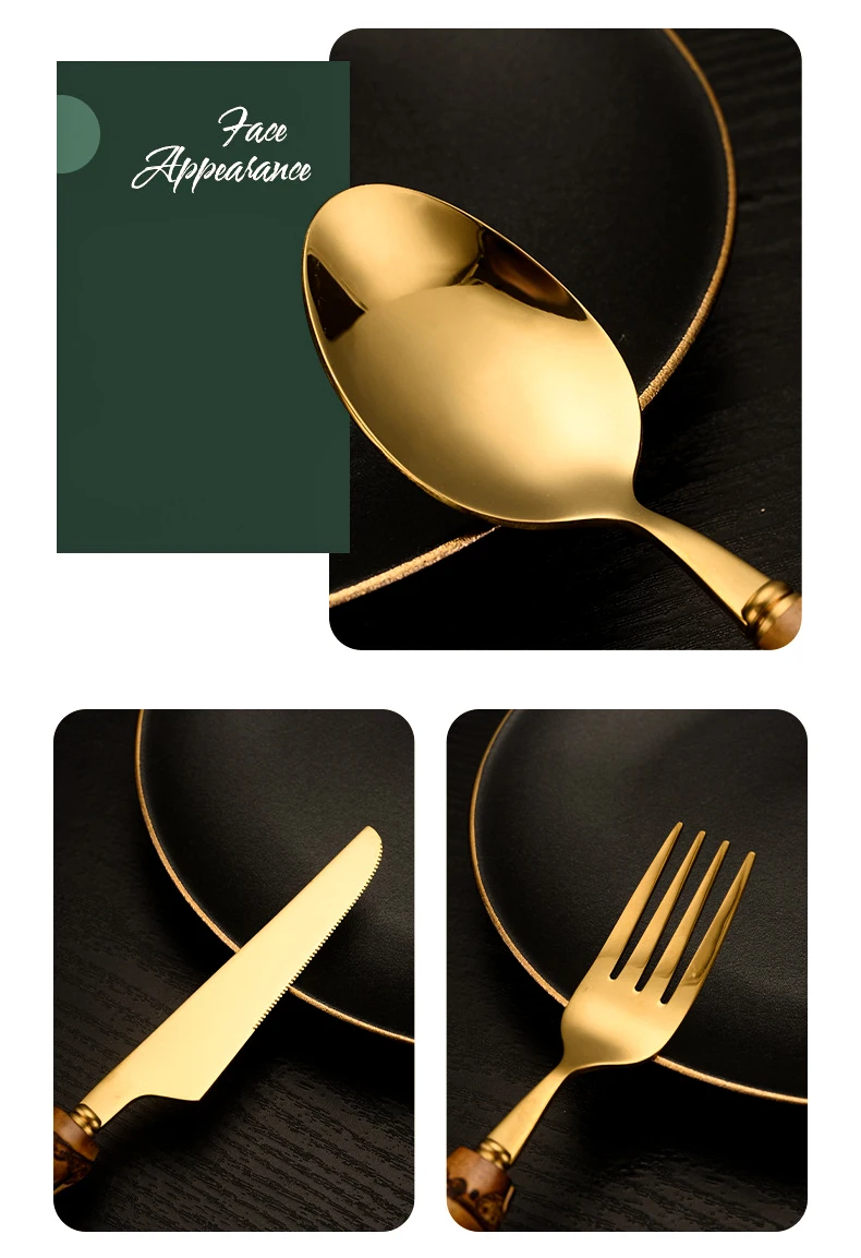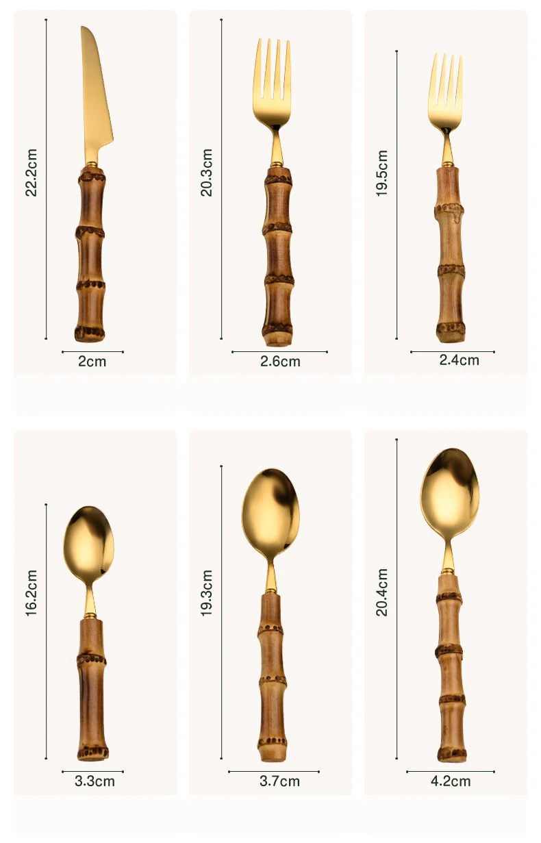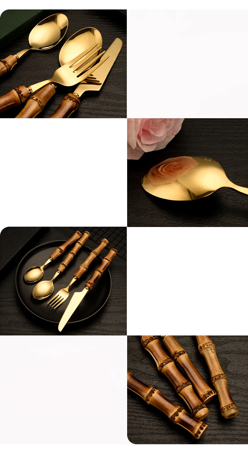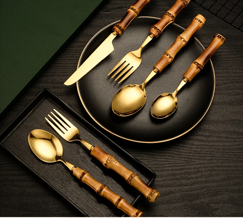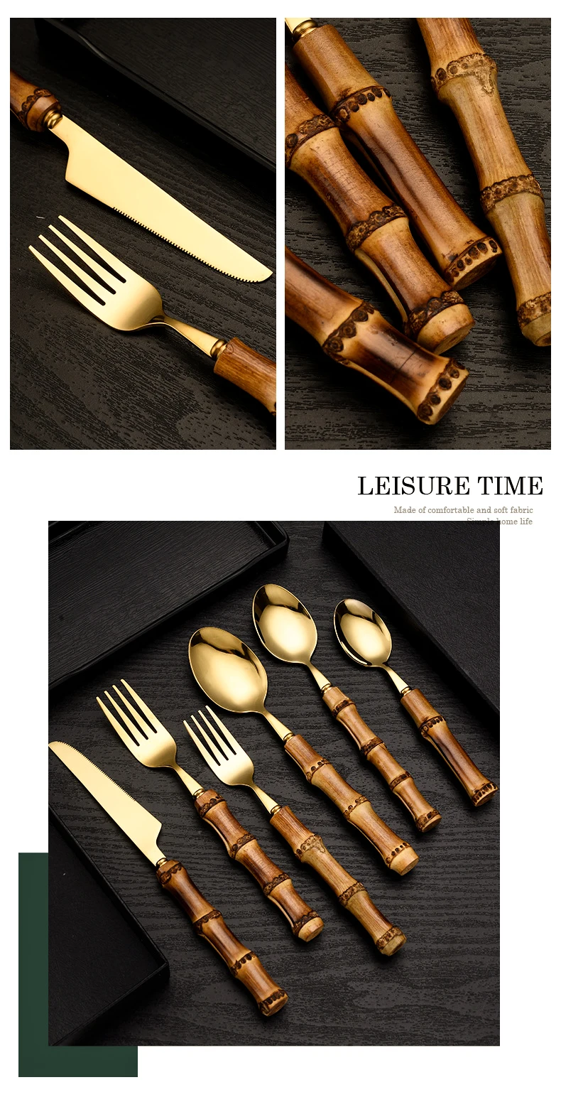 【Креативный дизайн 】 этот набор столовых приборов из нержавеющей стали оснащен ручками из бамбука ручной работы, ретро и элегантный, зеркальная полированная поверхность всегда сохраняет свой блеск.