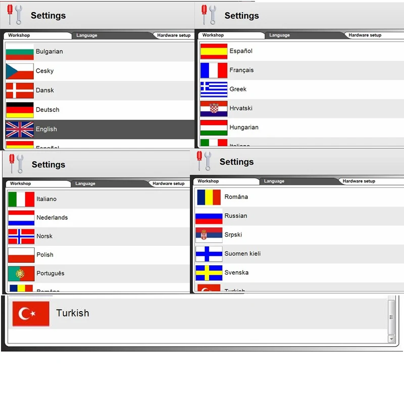 Английский, чешский, датский, немецкий, испанский, французский, греческий, голландский, венгерский, итальянский, норвежский, польский, румынский, русский, Srpski, Suomen kieli, svensk, турецкий и так далее, как показано на картинке