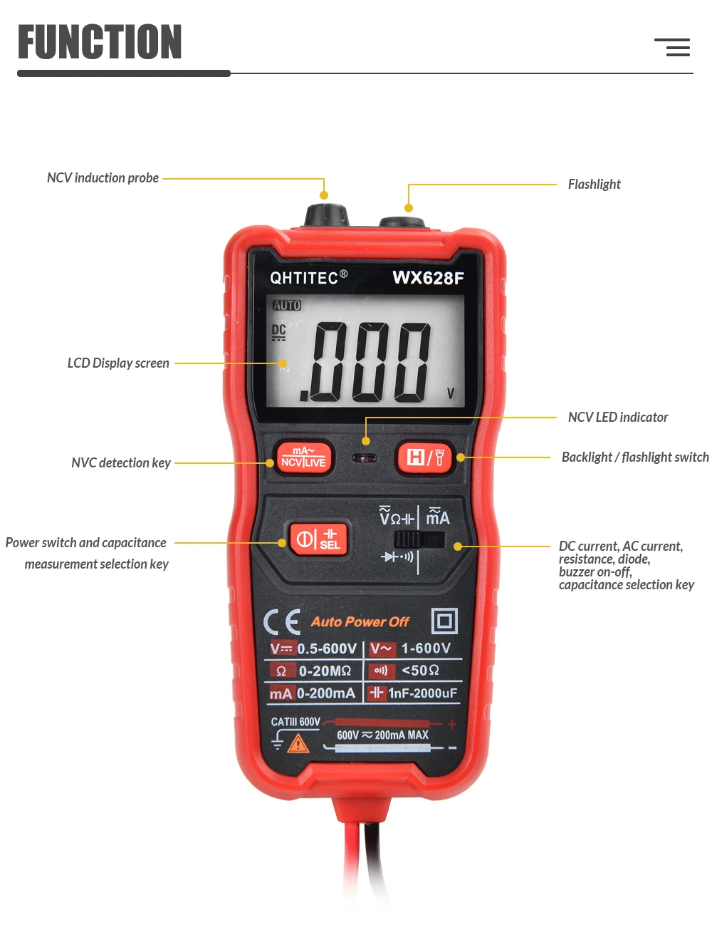 2. Измеритель может измерять напряжение постоянного тока, напряжение переменного тока, постоянный ток, ток переменного тока, сопротивление, диод, непрерывность теста зуммер и емкость; Он имеет функцию Бесконтактного обнаружения напряжения (NCV), незамедлительно напоминаем пользователям обращать внимание на безопасную работу, делая пользователей более безопасными и уверенными.