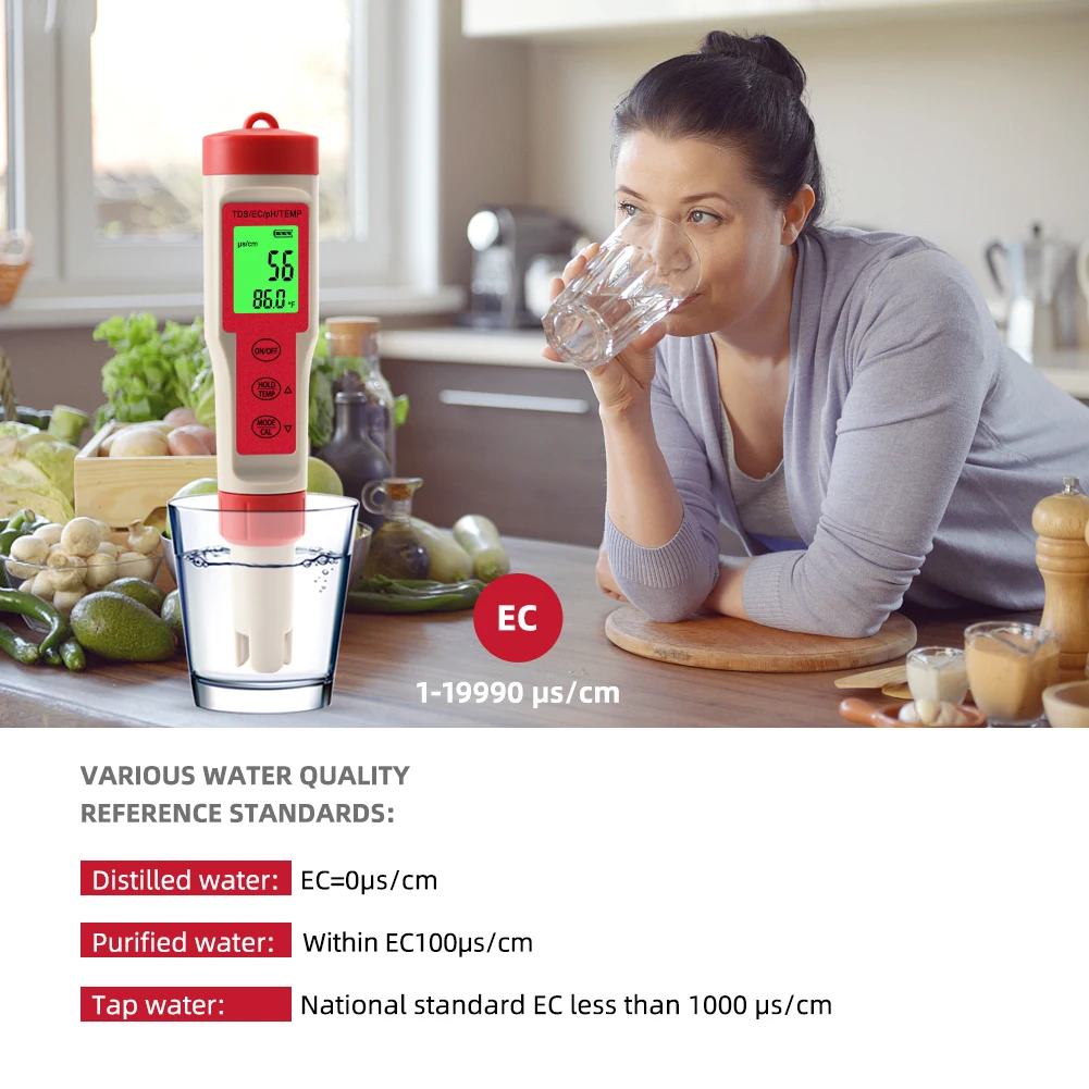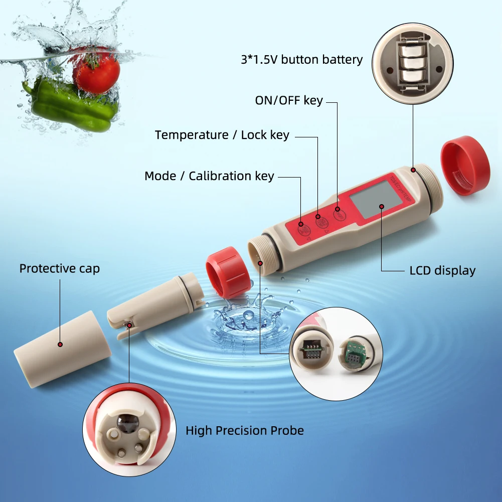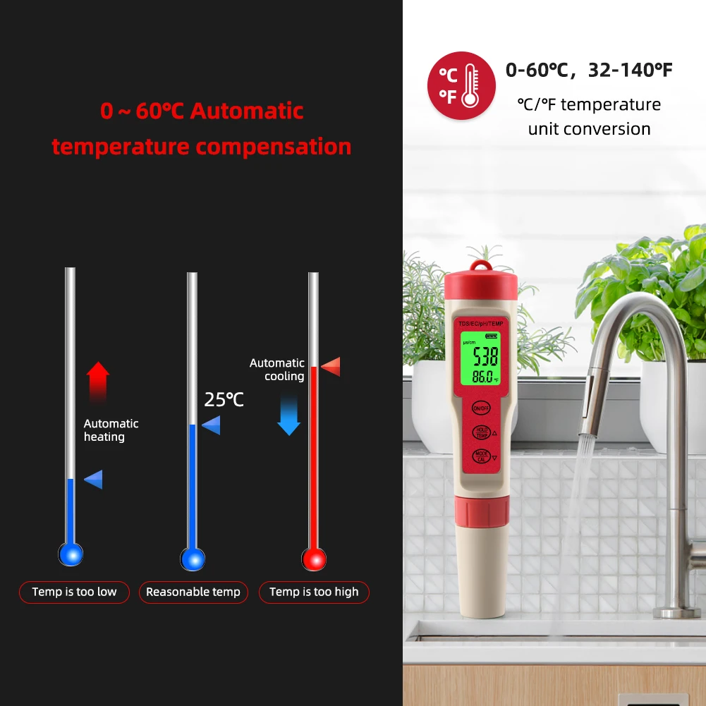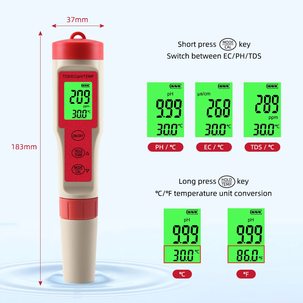 Многофункциональные, EC/PH/TDS и ℃/° F можно переключать свободно. 0 ~ 60 °C Автоматическая компенсация температуры, высокая точность, Быстрое измерение. ЖК-дисплей, высокая точность, сменный зонд, прост в использовании.