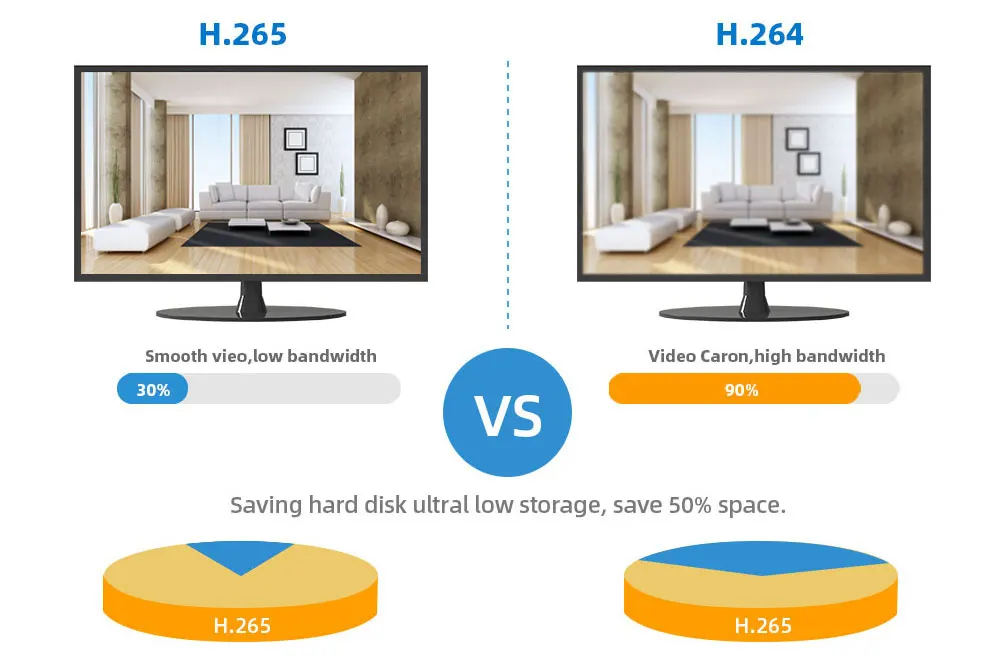 H.265 (HEVC) doubles the coding efficiency compared with its predecessor H.264. H.265 video saves around 50% of the bit rate at the same quality of coding.H.265 only need less bandwidth,faster loading speed,more smooth video,Lower bite rate,higher image quality!
