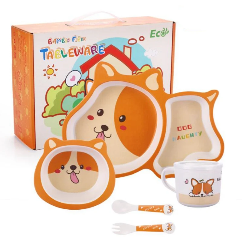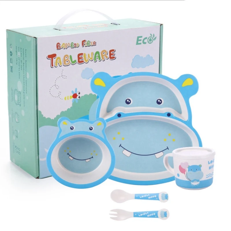 Укусы 5 шт./компл., посуда для кормления детей, Бамбуковая тарелка с изображением животных из мультфильма, обеденная тарелка для малышей, набор посуды для еды, Товары для детей