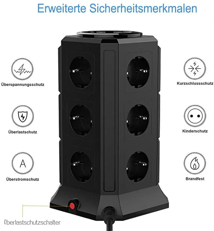 Несколько розеток 12 расположены вертикально на 4 поверхностях несколько разъемов. Распределительная розетка обеспечивает достаточно места для каждого отдельного слота, чтобы сэкономить место и место. Wi-Fi 5 портов USB гнезда башня представляют собой интегрированную умная ИС (интеграционная схема с совокупными характеристиками 4,5 a. Он может автоматически распознавать ваши устройства и обеспечивает максимально Быстрый ток до 2,4 A подключение.