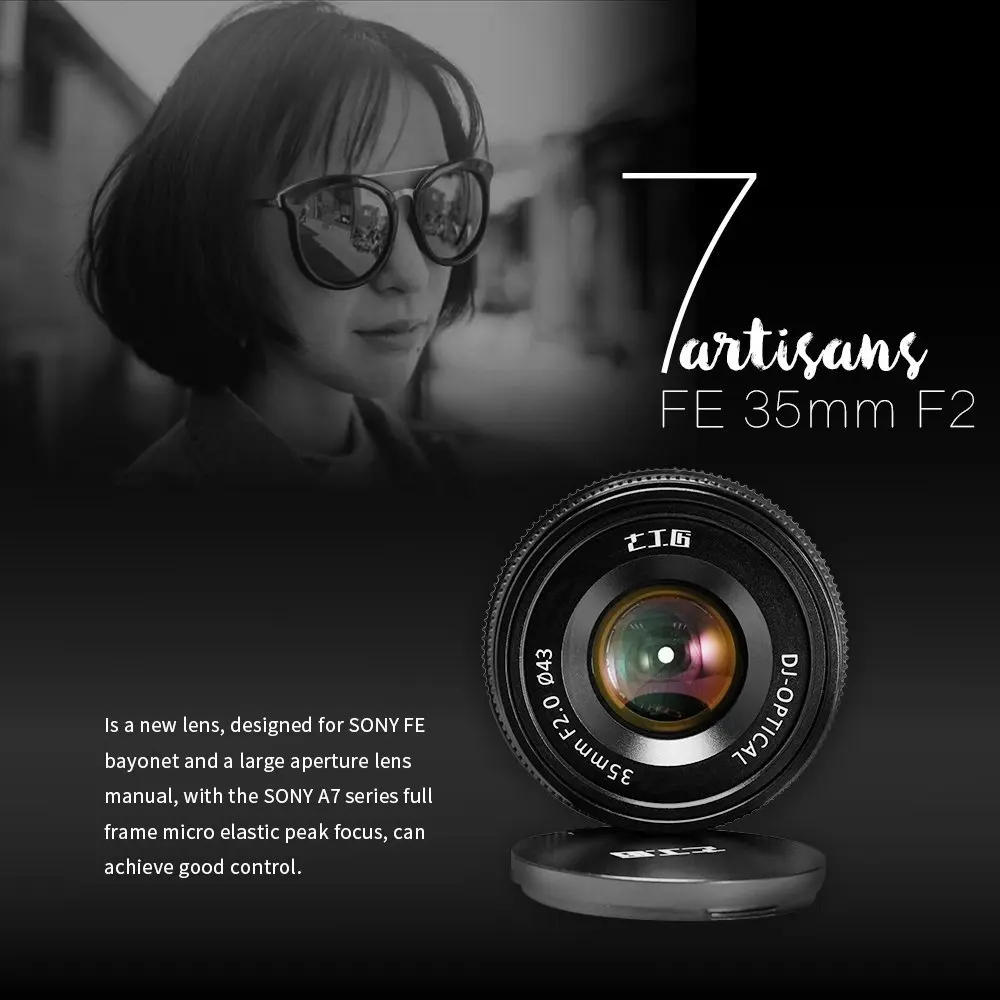 Объектив 7 Artisans FE 35 мм F2 очень подходит для туризма, уличной съемки, портрета, съемки в документальной сцене, диапазона диафрагмы F2-F16, 5 группа из 7 штук оптические стекляннo линзa, расстояние фокусировки 0,35 М фильтр, 43 мм, общий размер 55 мм * 60 мм, вес 320 г