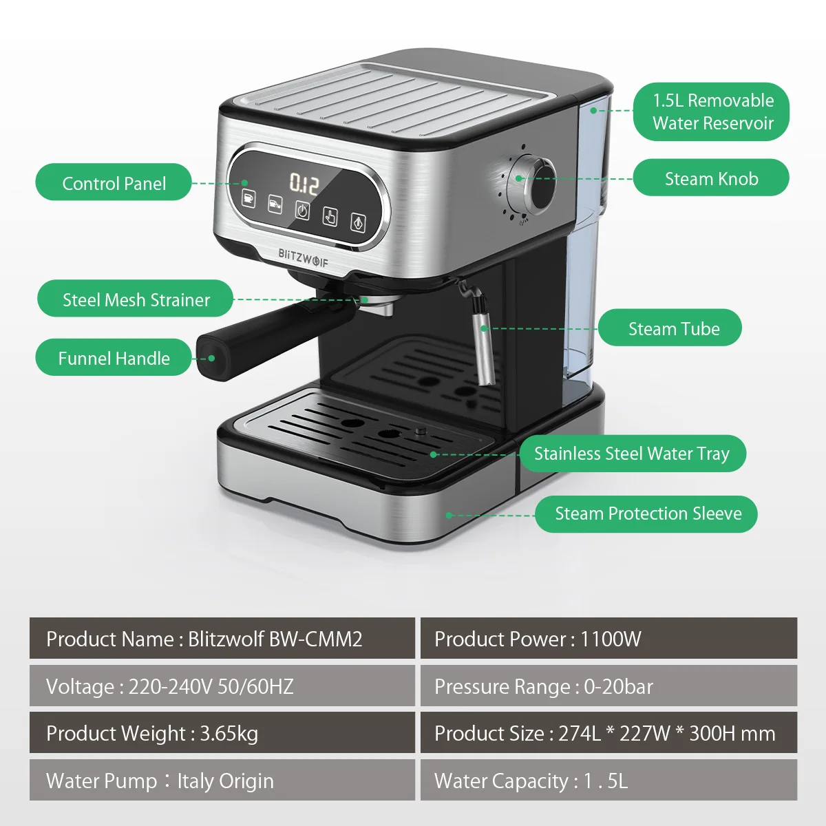 BW-CMM2 Эспрессо машина 20 бар высокого давления извлечение профессионального молока точный контроль двойная система безопасная защита 1100W