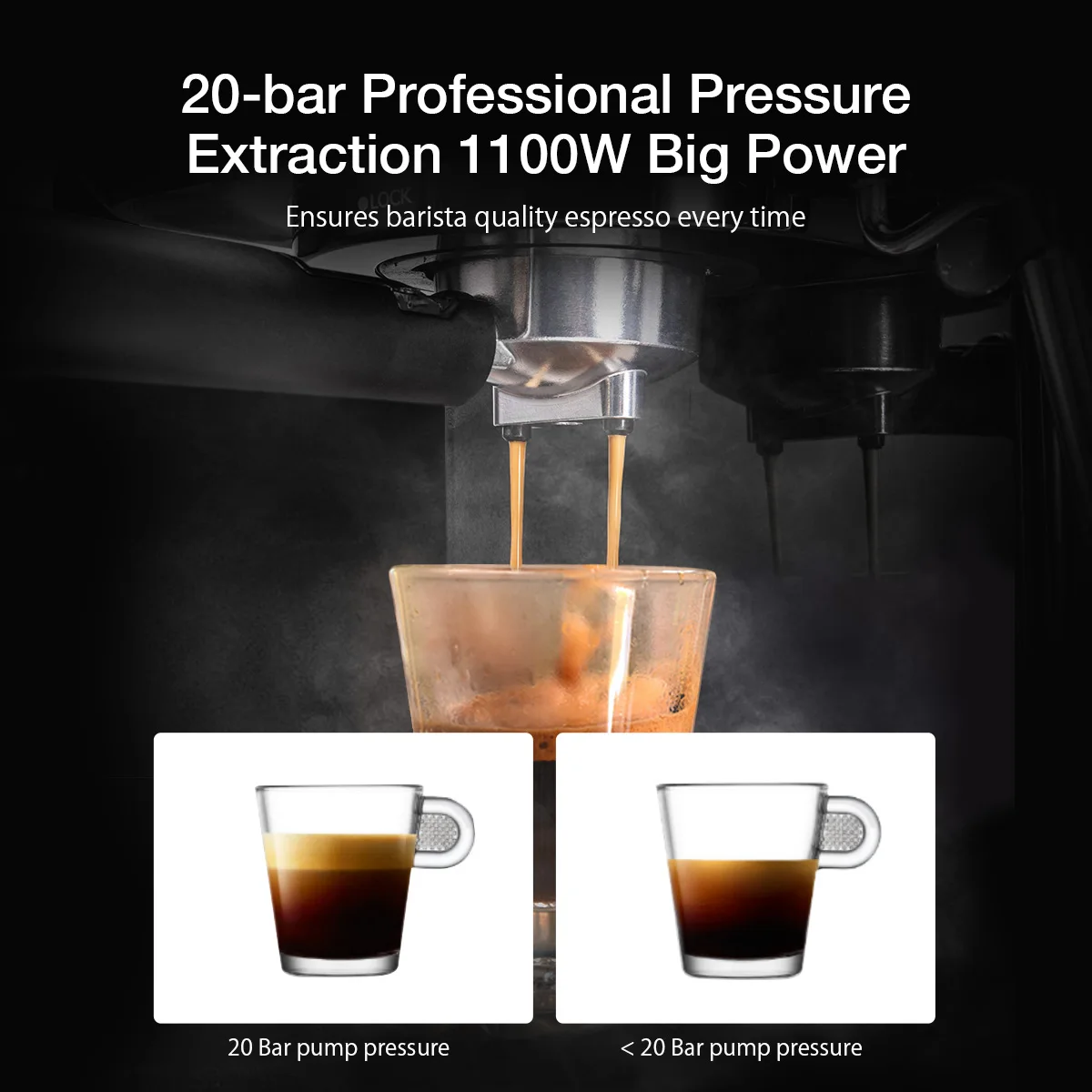 * 20 бар высокого давления:Экстракция, 1100 Вт большая мощность формы красивый кофе крем и гладкий вкус быстро.