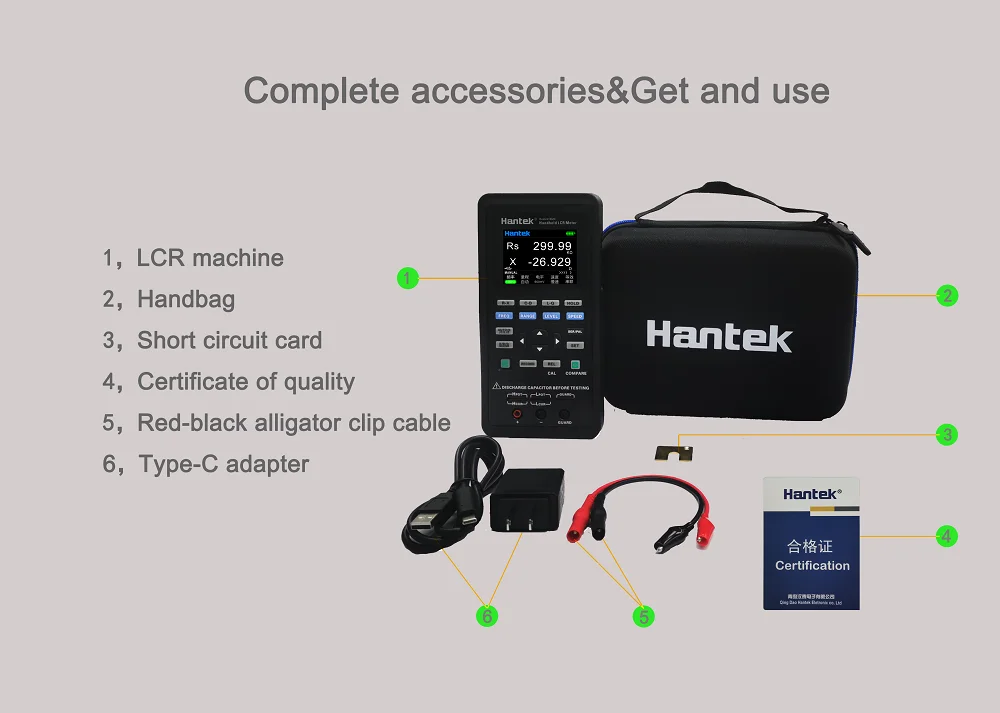 Hantek1832C/Hantek1833C handheld LCR-это портативный ручной измерительный прибор для измерения параметров компонентов, таких как индуктивность, емкость, сопротивление и т. Д. Небольшой объем, питание от литиевой батареи 5 В, может соответствовать требованиям к настольному LCR приложению, а также может применяться для измерения расхода и ручных измерений.