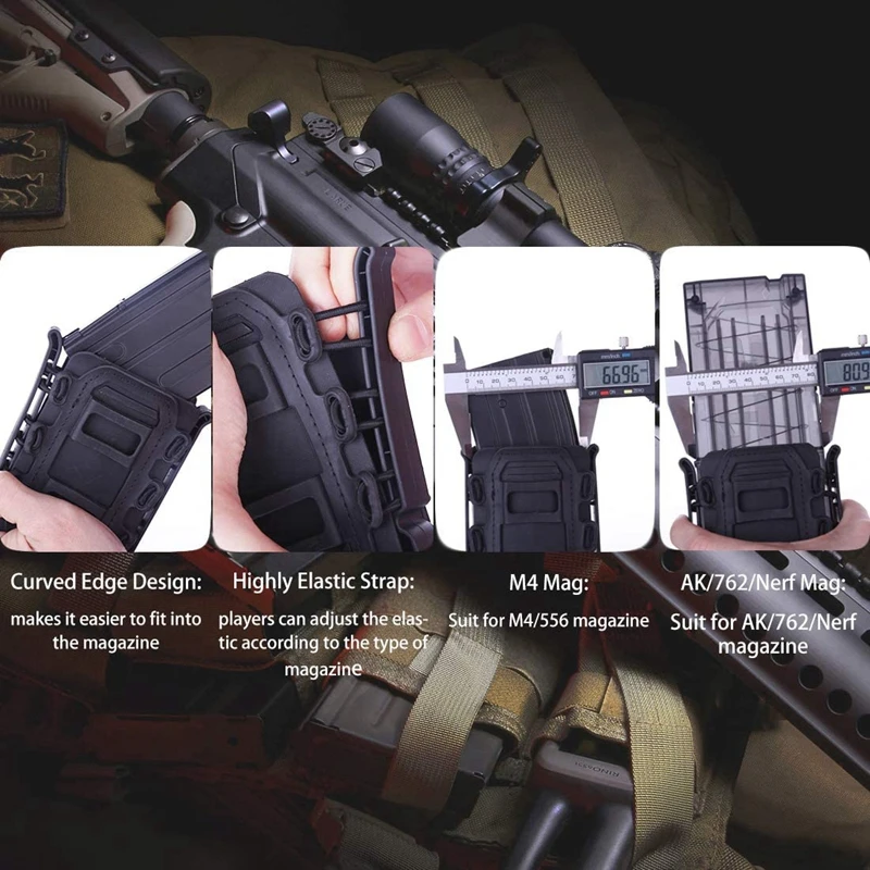 2. Передняя может быть загружен с шириной меньше, чем 1,2 дюймов пистолет полоски и другие продукты, хорошая совместимость, подходит для большинства 5,56 мм и 7,62 мм журнал сбоку из термопластичной резины пластины.