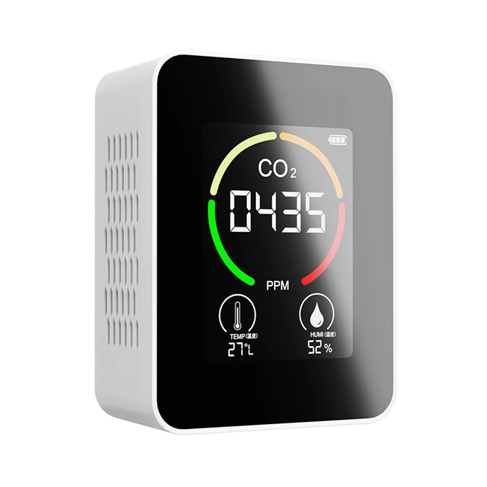 LCD large screen, different font colors display different air quality, green 400-799ppm, yellow 800-1199ppm, orange 1200-1599ppm, red 1600-1999ppm, 2000ppm above four colors flash at the same time.