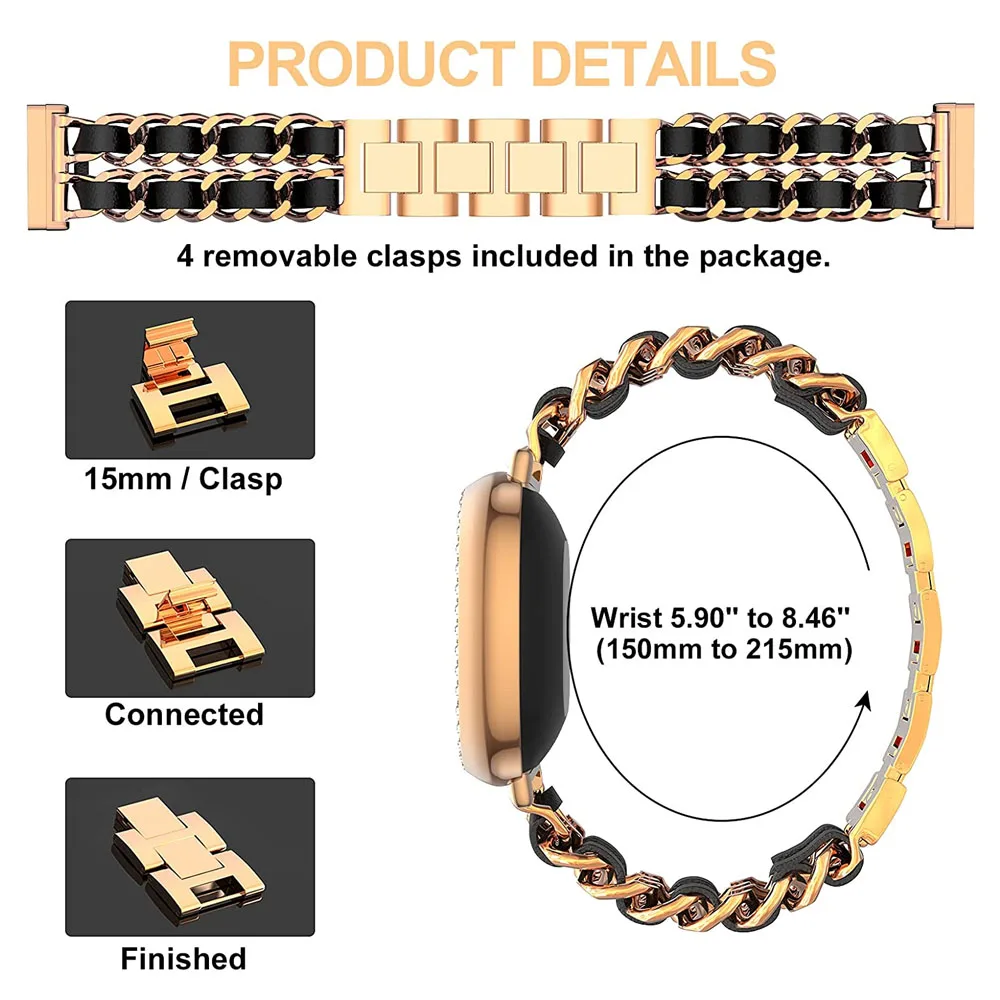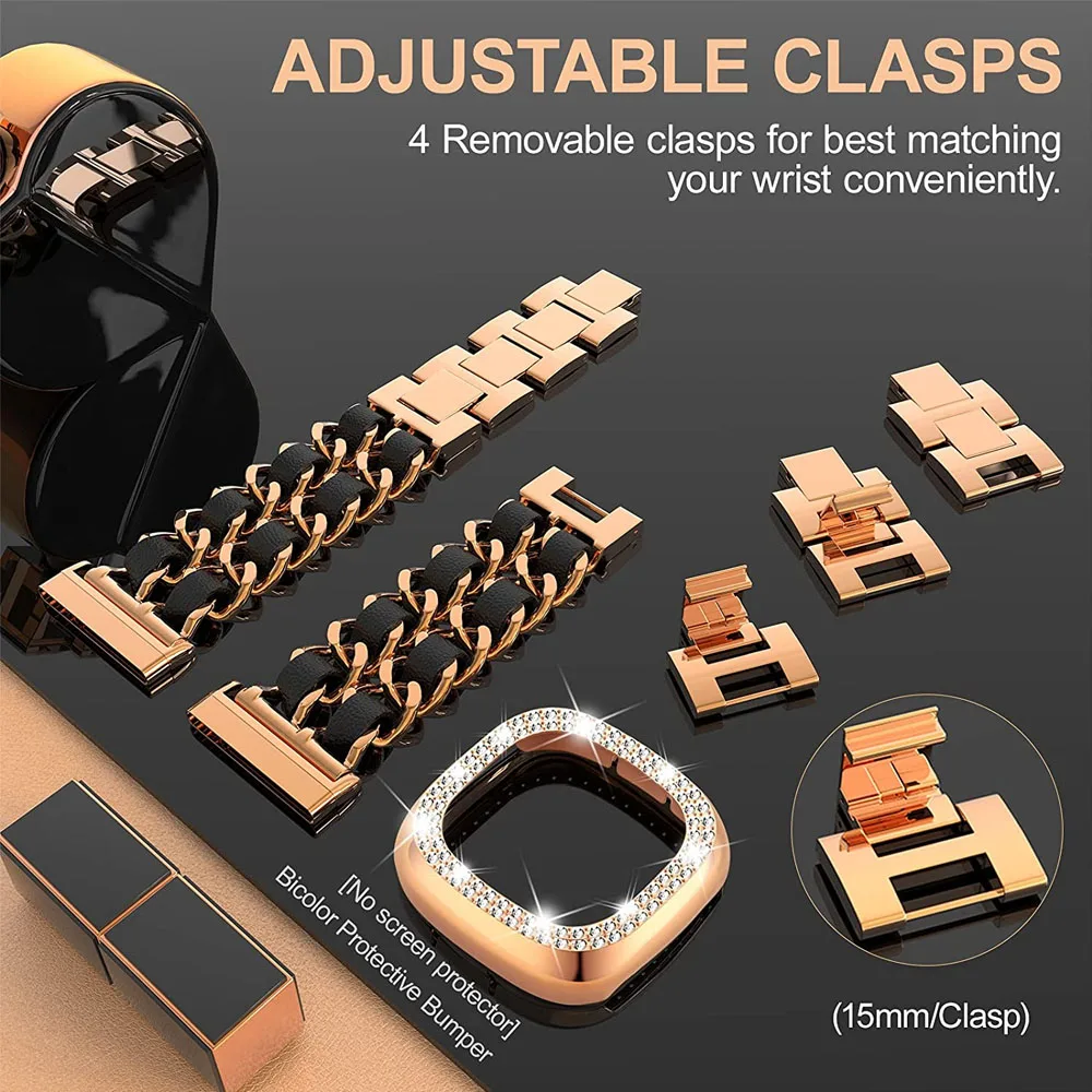 Регулируемый металлический ремешок для Fitbit Versa 3/Sense, ремешок для часов с браслетом, блестящий чехол-бампер, женский кожаный ремень с цепочкой из нержавеющей стали