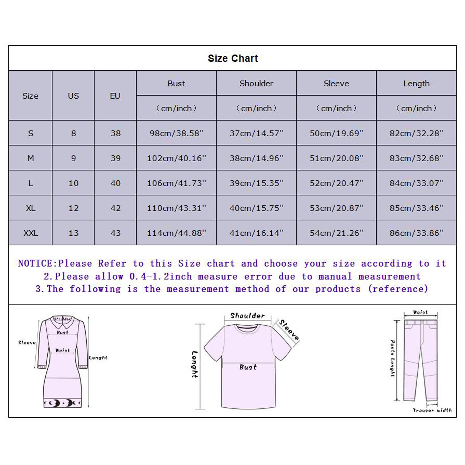 Размеры США ЕС Бюст Плечо Рукав Длина S 8 38 98 см/38,58'' 37 см/14,57'' 50 см/19,69'' 82 см/32,28'' М 9 39 102 см/40,16'' 38 см/14,96'' 51 см/20,08'' 83 см/32,68'' L 10 40 106 см/41,73'' 39 см/15,35'' 52 см/20,47'' 84 см/33,07'' XL 12 42 110 см/43,31'' 40 см/15,75'' 53 см/20,87'' 85 см/33,46'' XXL 13 43 114 см/44,88'' 41 см/16,14'' 54 см/21,26'' 86 см/33,86''