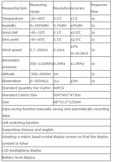 Диапазон: 0 ~ 30 м/с, 0 ~ 90 км/ч, 0 ~ 5860 футов/мин, 0 ~ 55 узлов, 0 ~ 65mph