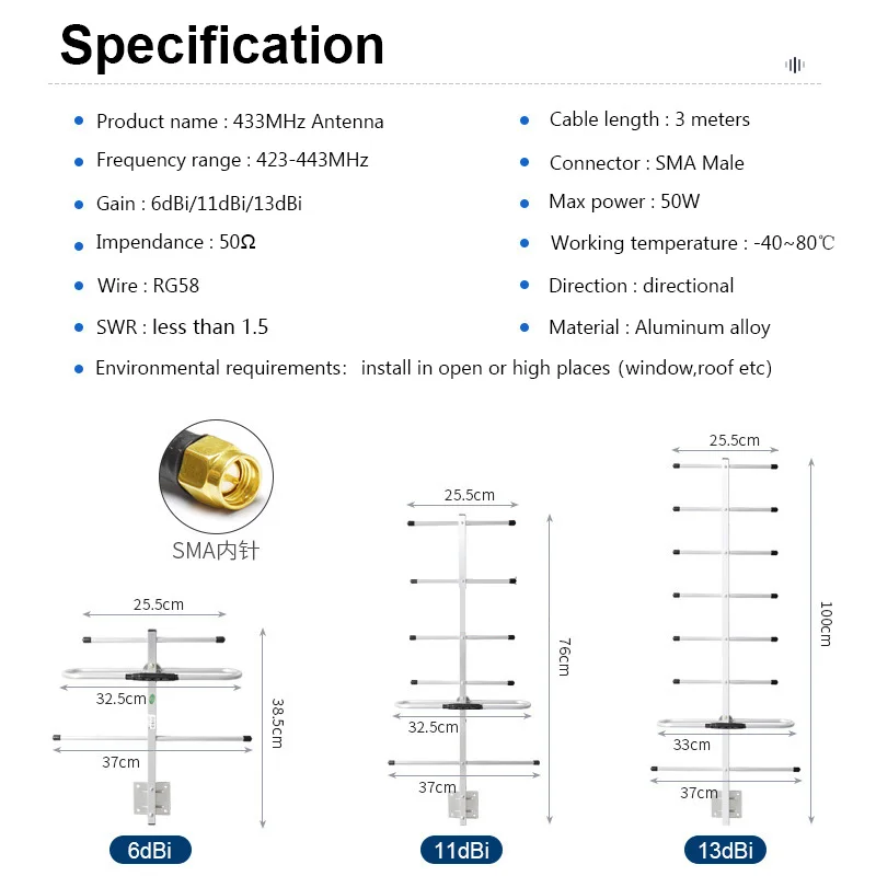 Высокий коэффициент усиленияСильная направленностьСильная способность анти-помехРеализовать междугородную связьПростая конструкция и Легкая разборкаЛегкий и прочный, легко устанавливаетсяВысокая эффективность затратМодель: Антенна YagiУВЧ: 423-443 МГцКоэффициент усиления: 6dBiРазъем: SMA MaleДлина кабеля: 3 метраВес: около 0,45 кг