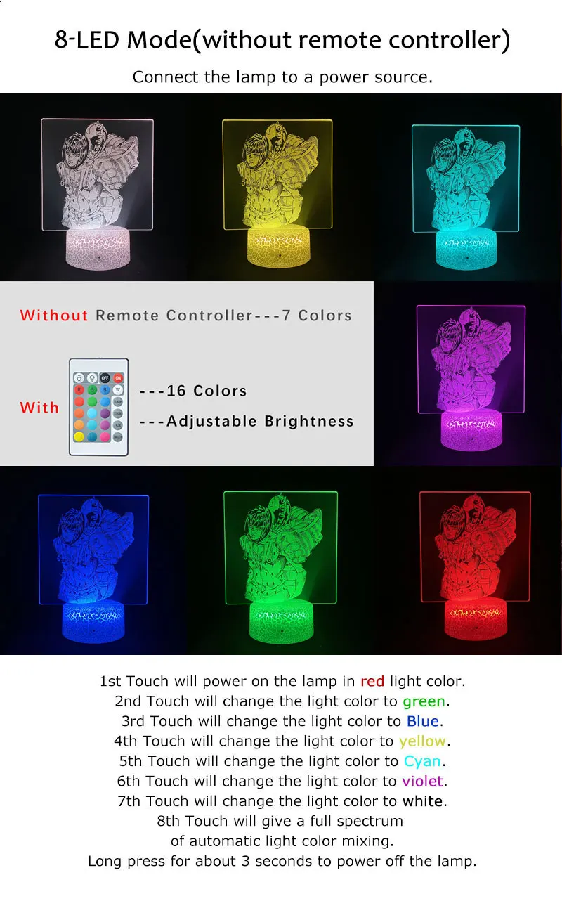 16 цветов с пультом дистанционного управления: красный, зеленый, синий, желтый, голубой, фиолетовый и белый, цвет изменится между этими 7 цветами на каждом пальце. Нажмите и удерживайте до 2 секунд, чтобы выключить светильник. Пульт дистанционного управления с включением/выключением, 16 цветов, регулируемая яркость, режим вспышки, плавный режим