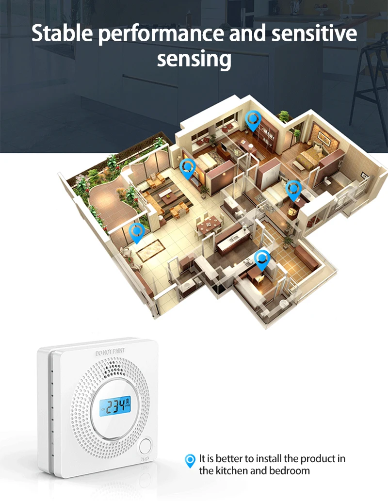 Это устройство с питанием от батареи Tuya WIFi приложение управления сигнализацией окиси углерода с передовым электрохимическим датчиком для домашнего использования. Обратите внимание, что данное устройство не обнаруживает дыма, тепла, пламени или других опасных газов.