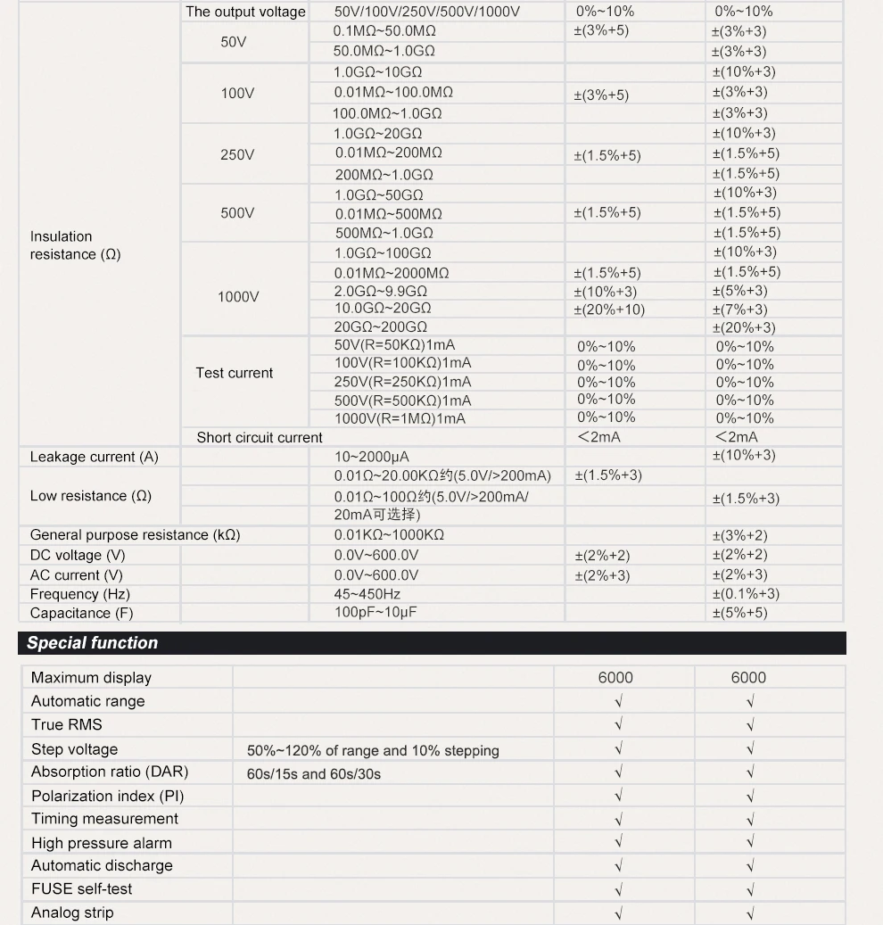 Технические характеристикиДиапазонUT505AСопротивление изоляции (Ω)50 в50 В/100 в/250 В/500 В/1000 в0% ~ 10%0.01MΩ ~ 50MΩ±(3% + 5)100 в0.01MΩ ~ 100MΩ±(3% + 5)250 В0.01MΩ ~ 200MΩ±(1.5% + 5)500 в0.01MΩ ~ 500MΩ±(1.5% + 5)1000 в0.1MΩ ~ 2000MΩ±(1.5% + 5)2GΩ ~ 9.9GΩ±(10% + 3)10GΩ ~ 20GΩ±(20% + 10)Ток нагрузкиС алюминиевой крышкой, 50В, оборот в минуту (R = 50kΩ) 1mA0% ~ 10%100 в (R = 100 кОм) 1мА0% ~ 10%250V (R = 250kΩ) 1mA0% ~ 10%500 В (R = 500kΩ) 1мА0% ~ 10%1000 В (R = 1MΩ) 1мА0% ~ 10%Ток короткого замыкания<2маНизкое сопротивление (Ω)0.01Ω ~ 20kΩ (около 5V/>200mA)±(1.5% + 3)Напряжение постоянного тока (В)0V ~ 600V±(2% + 3)Напряжение переменного тока (В)0V ~ 600V±(2% + 3)ОсобенностиСчетчик дисплея6000Авто Диапазон/True RMS√Ступенчатое напряжение10% шагов на 50% ~ 120% диапазона√DAR60s/15s и 60s/30s√PI/измерение времени√Автоматический разряд√Аналоговый барный график√Непрерывный зуммер√Сравнение измерений√Индикация низкого заряда батареи√Общие характеристикиМощность1,5 V батарея (LR6) x 6Дисплей78 мм x 59 ммЦвет изделияКрасный и серыйВес нетто продукта630 гРазмер изделия103 мм x 225 мм x 59 ммСтандартные аксессуарыБатареи, Тестовые провода, тестовые зонды, зажимы для аллигатораСтандартная индивидуальная упаковкаСумка для переноски, Подарочная коробка, руководство на английском языкеСтандартное количество в коробкеДетские носки 20 предметовСтандартное измерение коробки515 мм x 380 мм x 385 мм (0,075 куб. М в стандартной коробке)Стандартная коробка Вес брутто20,8 кгДополнительный аксессуарДистанционный тестовый свинецЖЕНСКИЙ БРАСЛЕТ ЛУЧШИЕ ДРУЗЬЯ КОЖАНЫЙ способ оплаты какой доставки... Читать отзыв полностью...