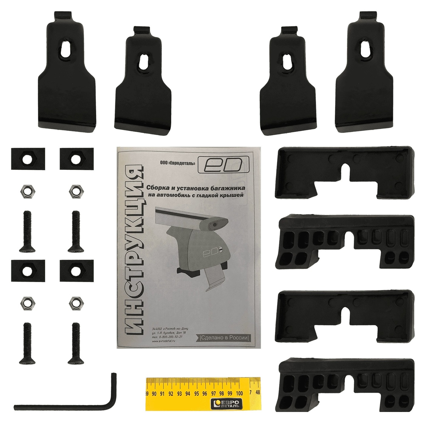 4 опоры - 2 прямоугольные поперечины - Индивидуальный установочный комплект - Инструмент для установки - Инструкция.