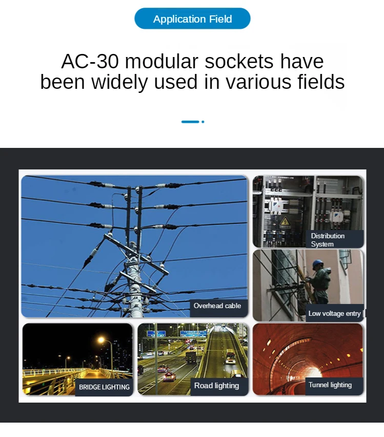 Модульные розетки серии AC30 используются в системах распределения электроэнергии в домах, гостиницах, аэропортах, доках и других местах и могут быть напрямую объединены с автоматическими выключателями серии D247 и распределительными коробками освещения.