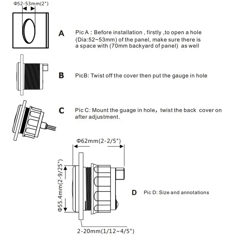 -Диаметр установки: Φ52 мм или 2-1/16''