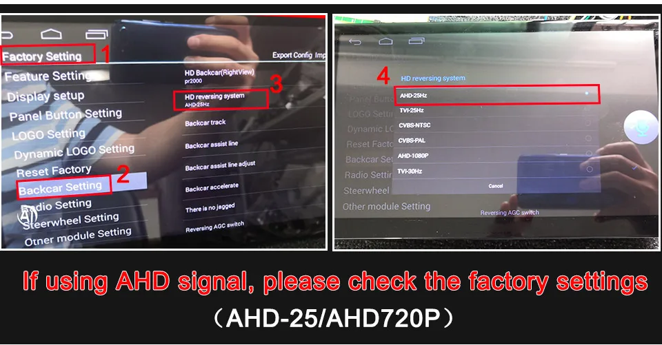 Go to Car settings >> Factory settings >> Reverse (picture) settings >> Select AHD720P/AHD 25