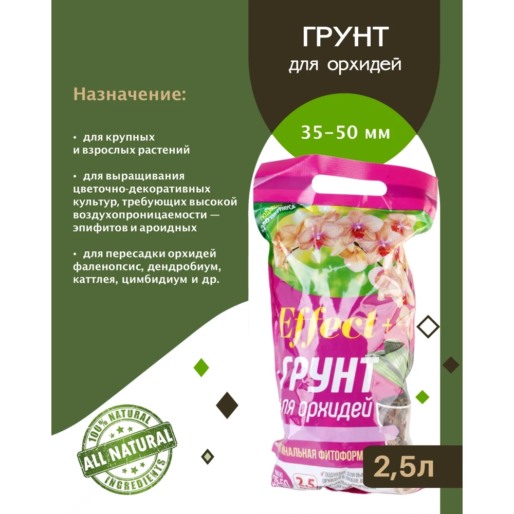 Грунт для орхидей Effect+ Maxi 35-50 мм 2,5 литра рекомендован для крупных и взрослых орхидей, а также для выращивания цветочно-декоративных культур, требующих высокой воздухопроницаемости – эпифитов и ароидных, в частности очень эффективен для пересадки орхидей: фаленопсис, дендробиум, каттлея, цимбидиум и др.