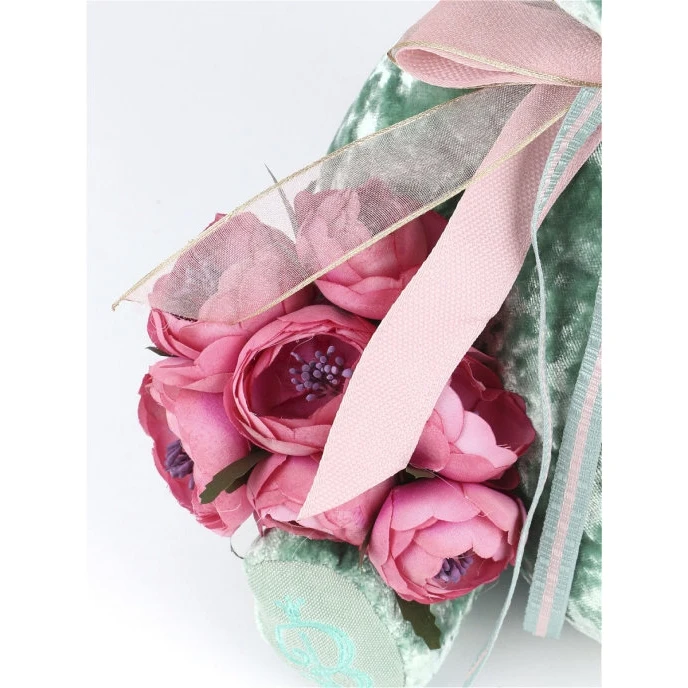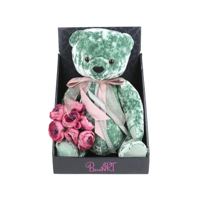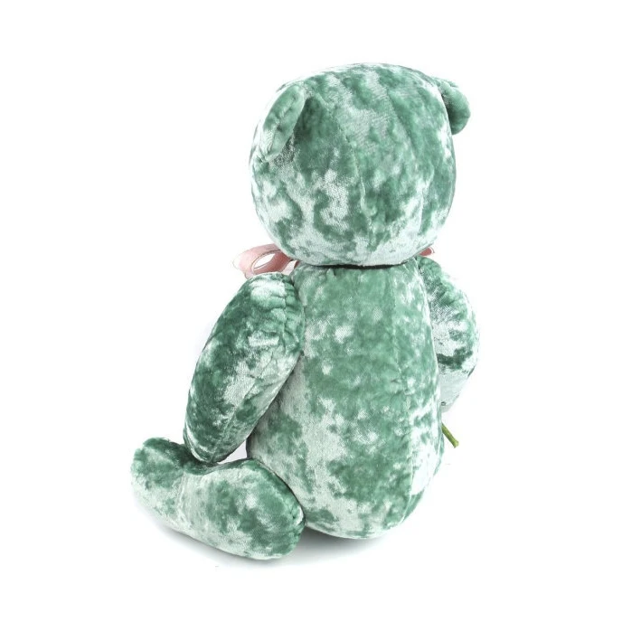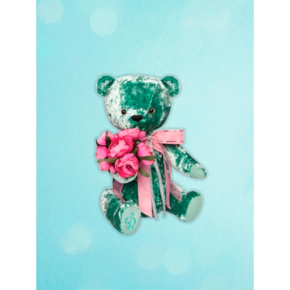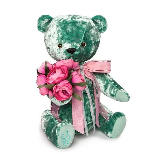 Бархатная ткань изумрудного цвета из которой изготовлен мишка красиво переливается при различном освещении и невероятно приятная на ощупь, а нарядный розовый бант на шее, который при необходимости легко снять, идеально сочетается с букетом и создает праздничное настроение. Благодаря шплинтовым креплениям, лапы и голова медведя подвижны и крутятся в разные стороны.