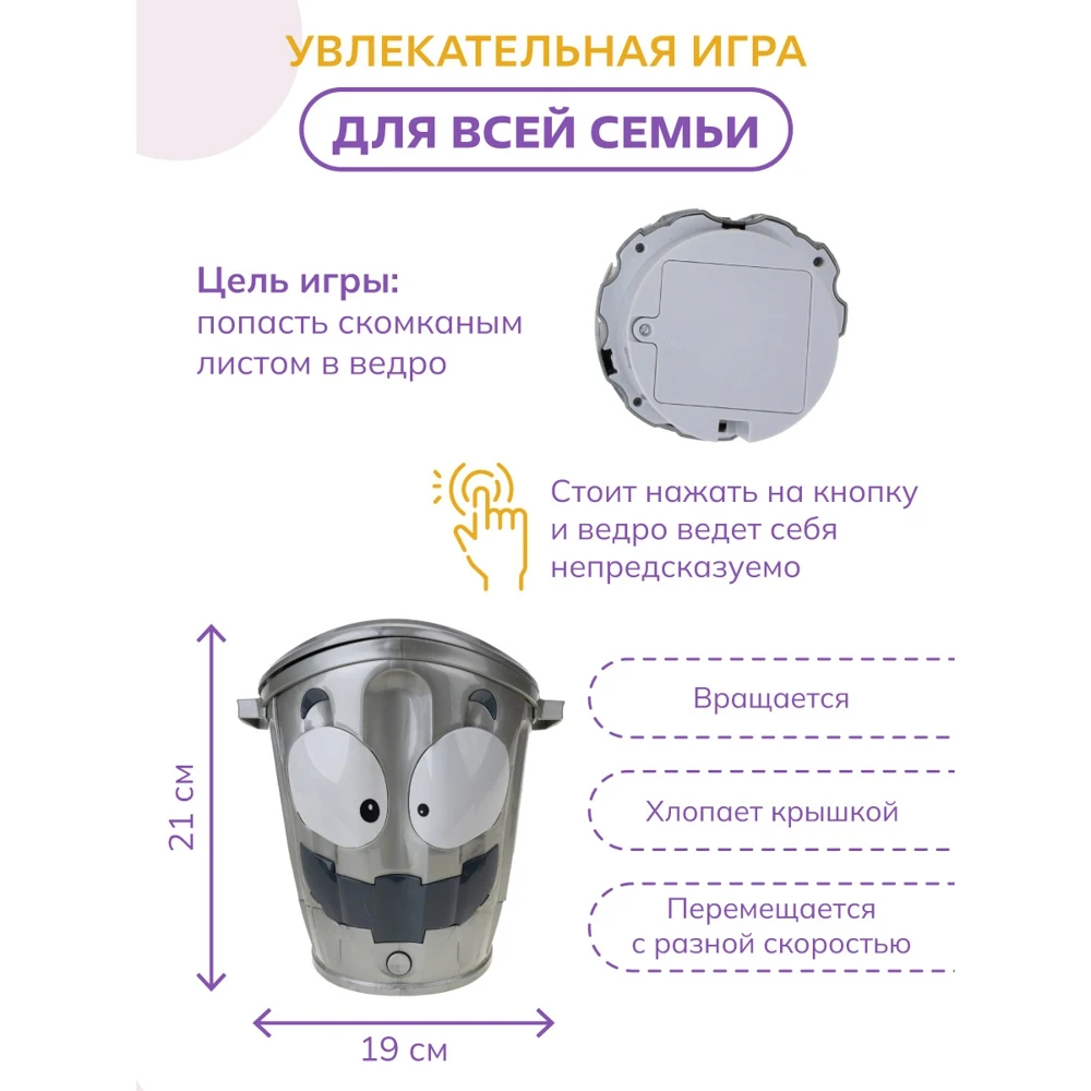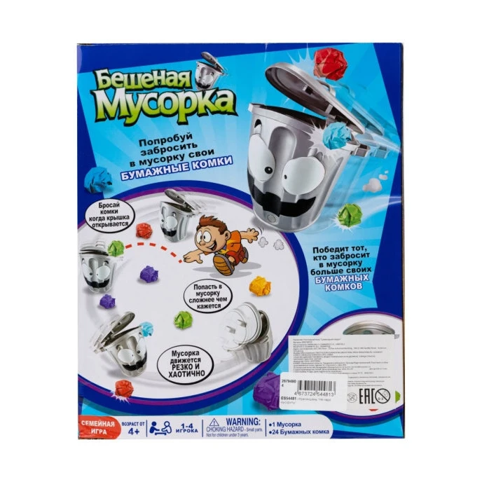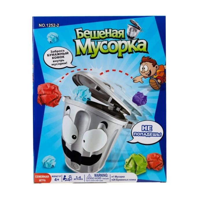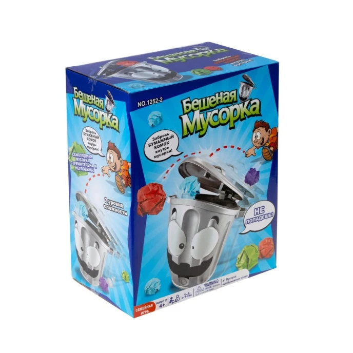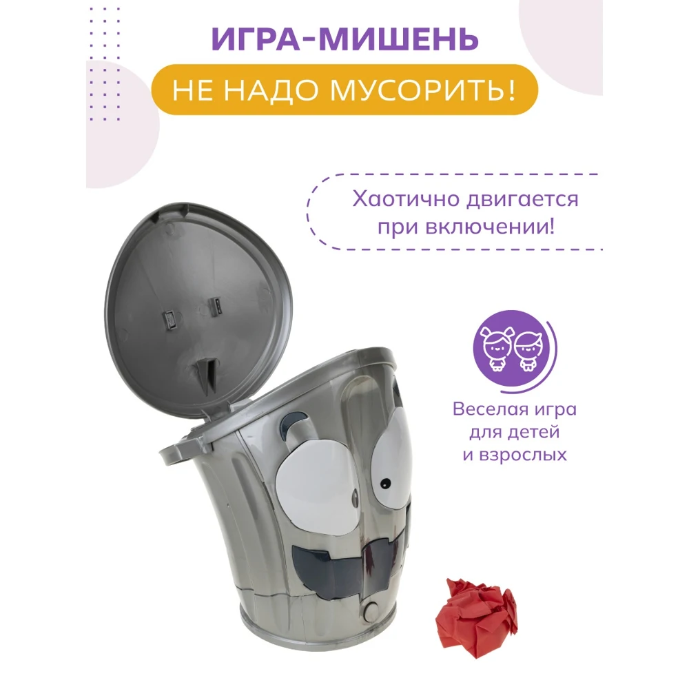 Игра-мишень Не надо мусорить-великолепная игра как для детей, так и для взрослых, для семейного досуга и для игр компаниями, не важно с кем и где вы играете, главное, что удовольствий и впечатлений будет масса. Принцип игры-забросить как можно больше скомканных листов в ведро, но ведро не простое, а шальное! Стоит только нажать на кнопку, как ведро начинает вести себя непредсказуемо, то резко набирает скорость, потом замедляется и плавно перемещается на месте, неожиданно меняет направление и начинает вращаться, при этом хлопая крышкой. Задача игроков забросить в убегающую мусорку максимальное количество бумажных комков, ведь победит самый меткий! Игра тренирует ловкость, логическое мышление, реакцию и внимание, а также поднимает настроение. В комплект входит ведро (в разобранном виде) и 24 цветных листа бумаги. Работает от батареек, 4 шт. тип АА.