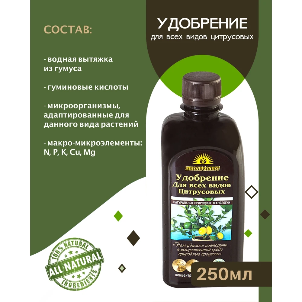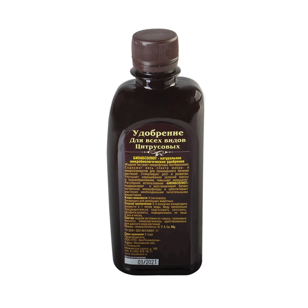 Натуральное микробиологическое Удобрение «Абсолют» специально разработано для подкормки цитрусовых и других средиземноморских растений, выращиваемых в горшках и контейнерах в теплице или оранжерее, и обеспечивает получение красивых и полезных плодов.Цитрусовые долгоживущее растение и обычно растет в одном и том-же горшке или контейнере много лет.Жидкий экстракт микрофлоры экочернозема, содержит весь спектр макро- и микроэлементов для полноценного питания всех видов цитрусовых.Стимулирует рост и развитие растений, улучшает наращивание зеленой массы и корневой системы, повышает иммунитет.Регулярное использование «Абсолют» поддерживает и восстанавливает баланс почвенной микрофлоры и обеспечивает растение необходимыми питательными веществами.Удобрение предназначено для подкормки путем полива и опрыскивания всех видов цитрусовых растений (лимон, апельсин, мандарин, бергамот, грейпфрут, лайм, цитрон, каламондин и другие), а также кофе, инжир, гранат.