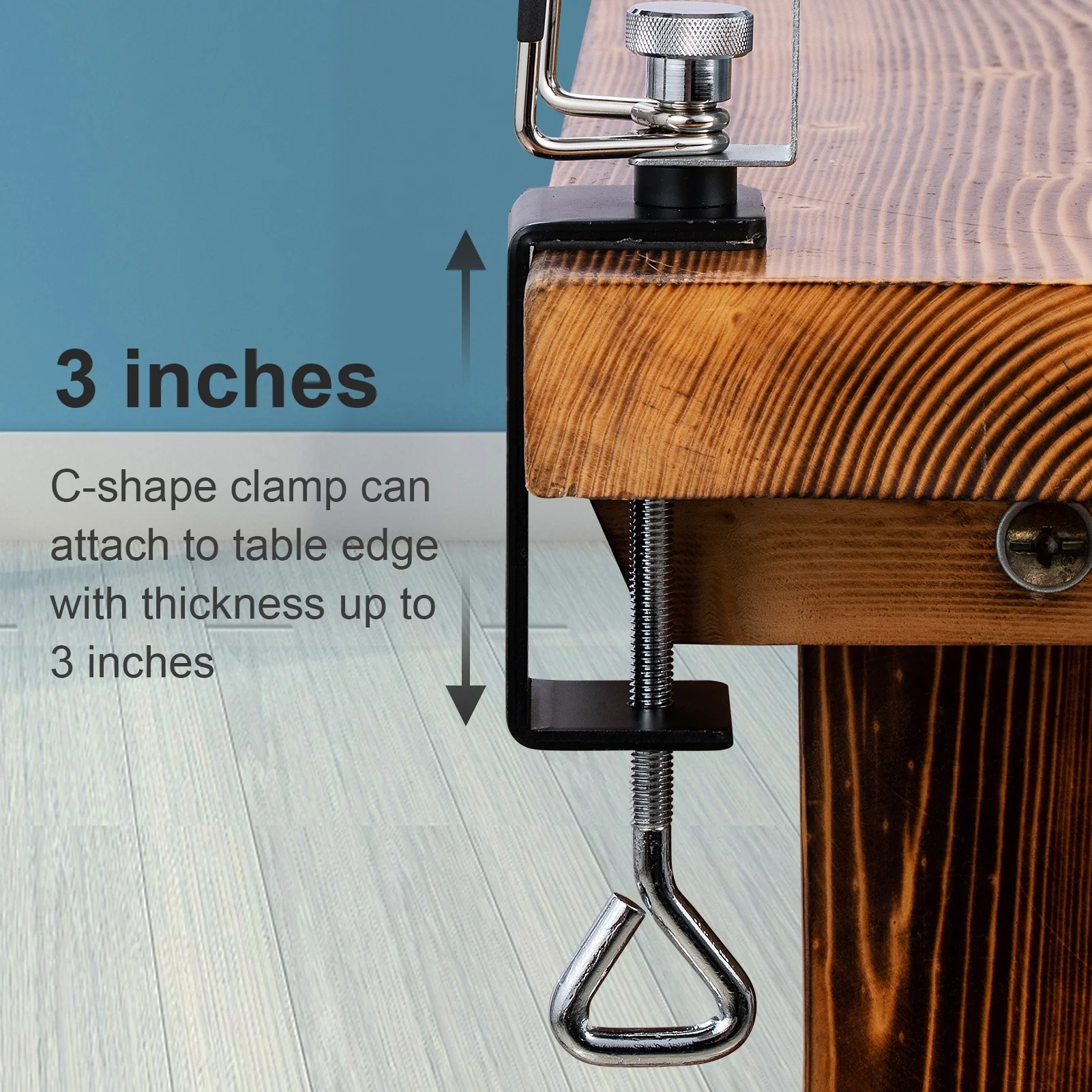 Зажим c-формы может прикрепить к краю стола толщиной до 3 дюймов.
