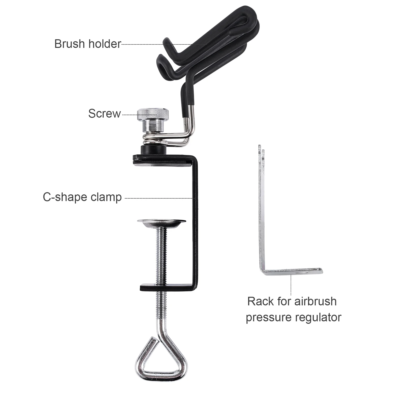 Держатель аэрографа предназначен для фиксации на кромке стола и надежного удержания кистей для удобного использования. Он имеет две стойки для кистей, которые могут поместиться практически в любые стили кистей и поворотов слева направо. Прочная конструкция для длительного использования.