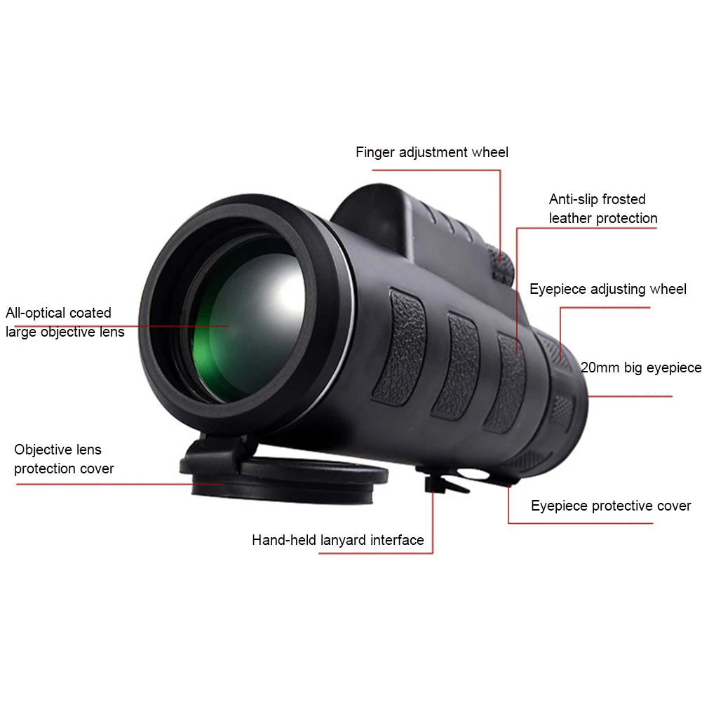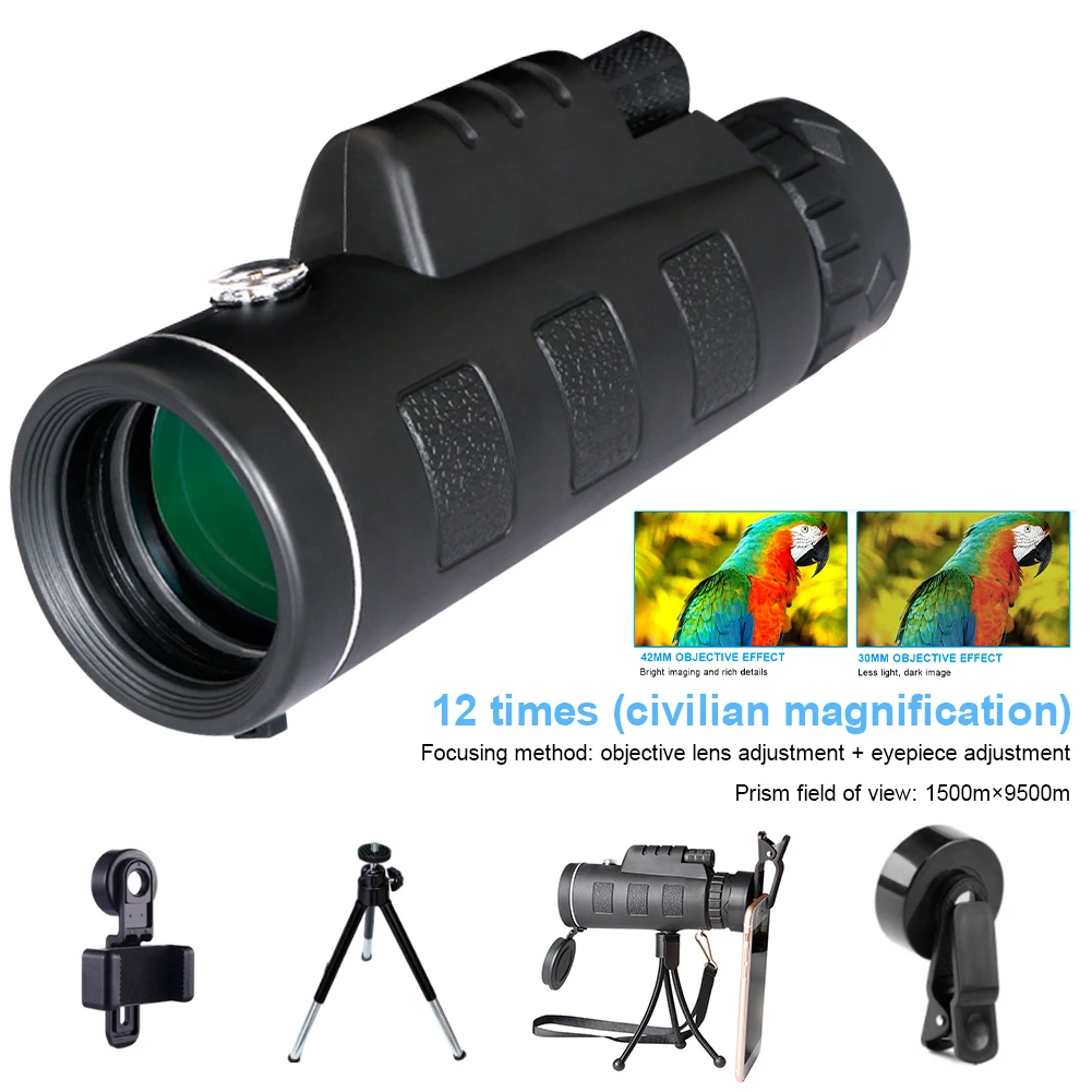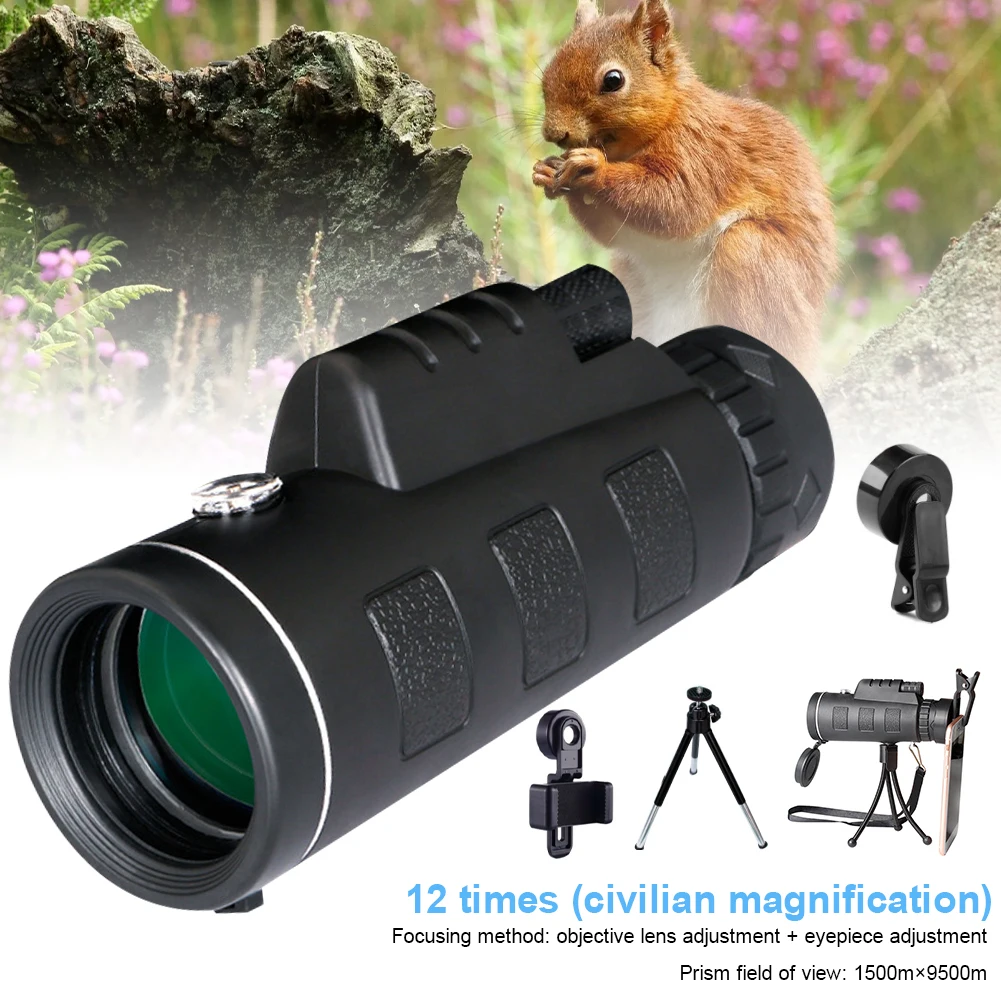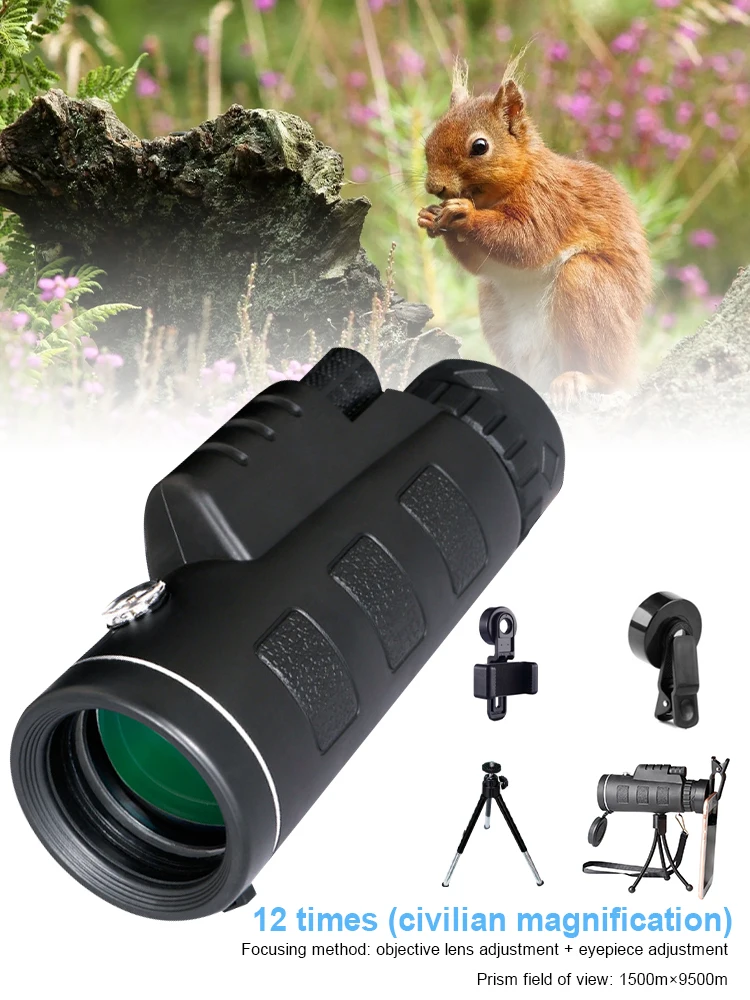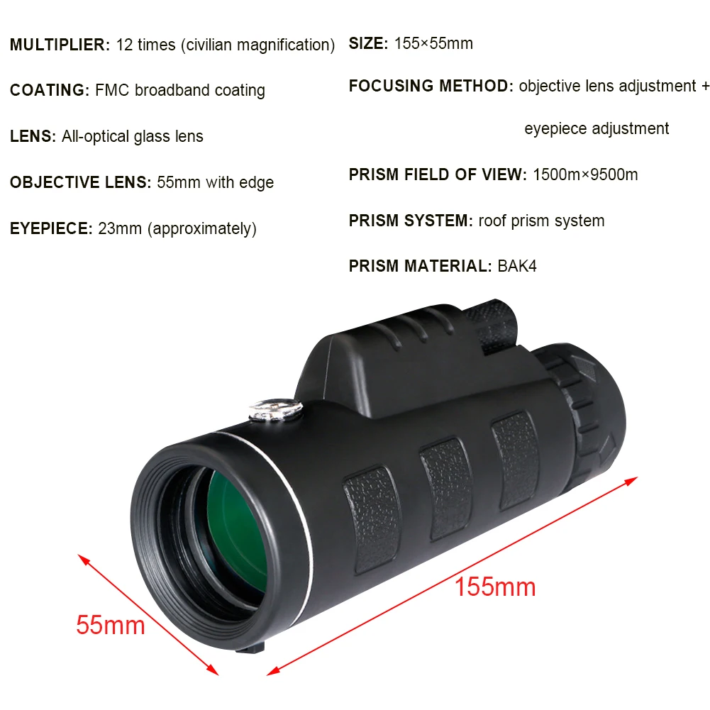 Особенности:* 1.[40X60 с высоким увеличением] Настоящее HD 12 раз увеличение и 55 мм Диаметр объектива Монокуляр, обеспечивая четкие и яркие изображения и наслаждаясь прекрасным пейзажем на расстоянии.