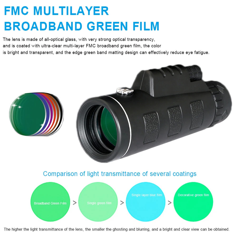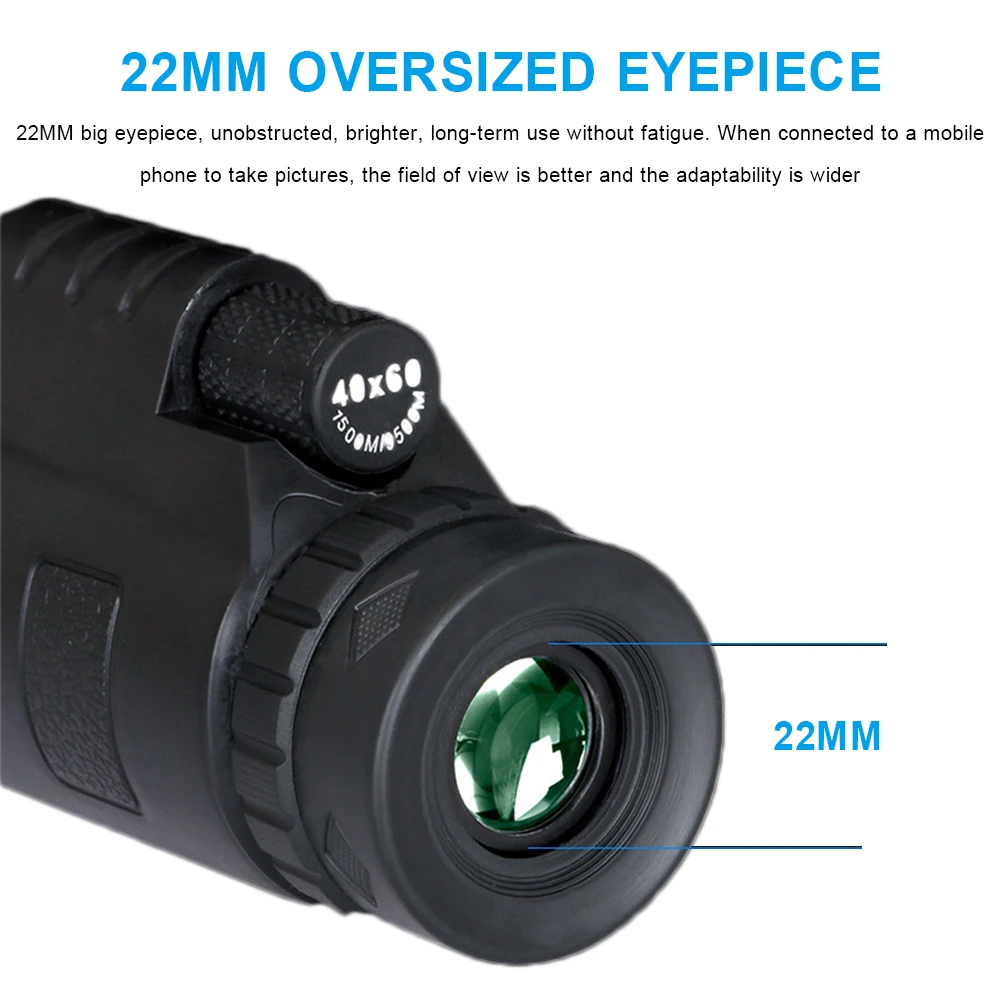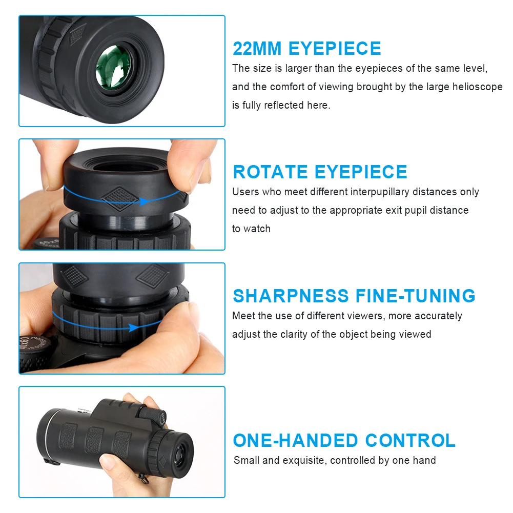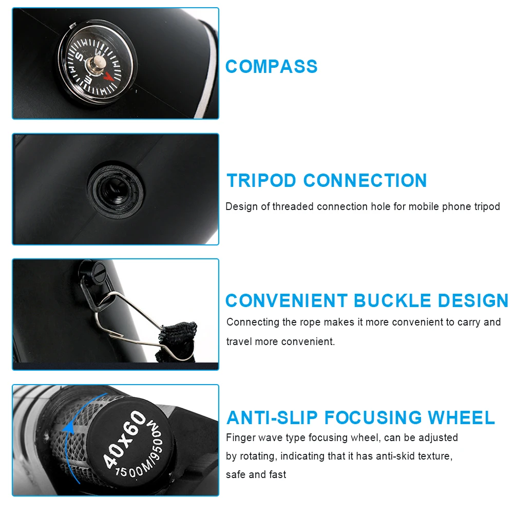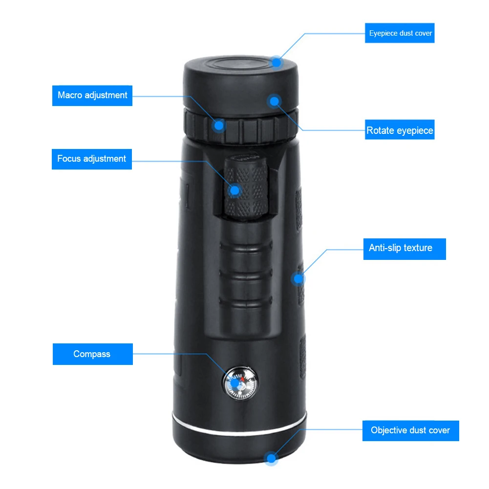 Особенности:* 1.[40X60 с высоким увеличением] Настоящее HD 12 раз увеличение и 55 мм Диаметр объектива Монокуляр, обеспечивая четкие и яркие изображения и наслаждаясь прекрасным пейзажем на расстоянии.