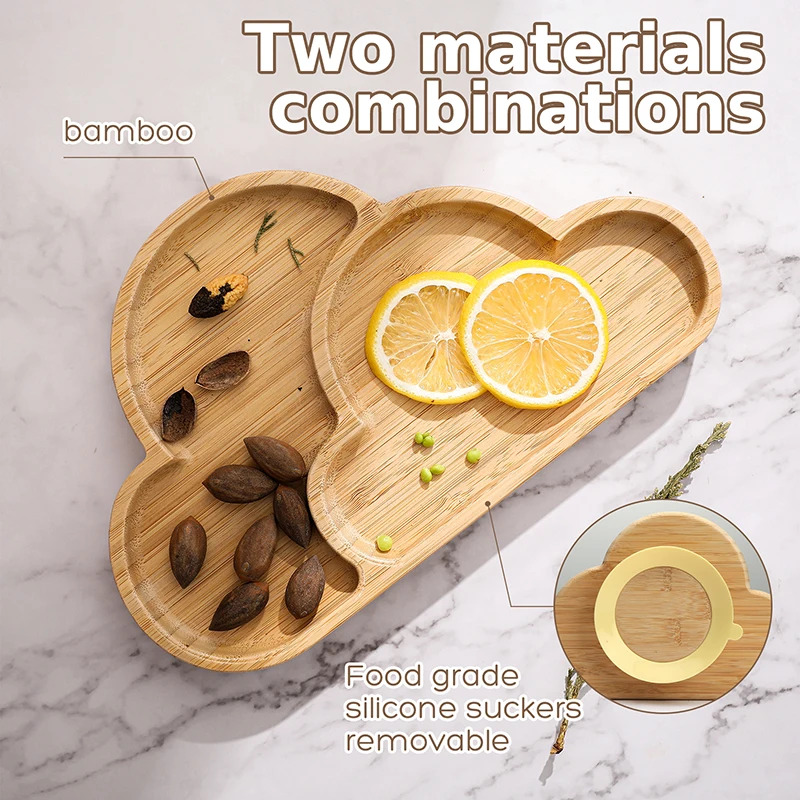 Набор ложек из натурального бамбука для малышей с мультяшными облаками, разделенная тарелка для ужина, обучающая тарелка для кормления новорожденных детей