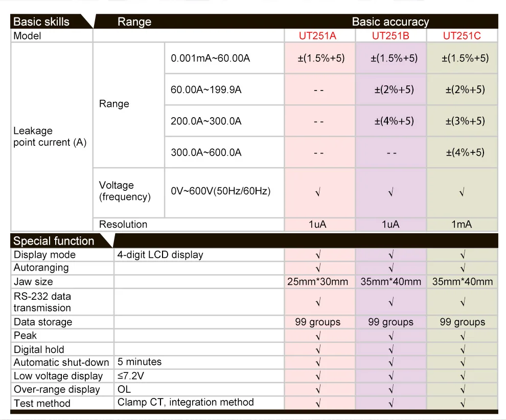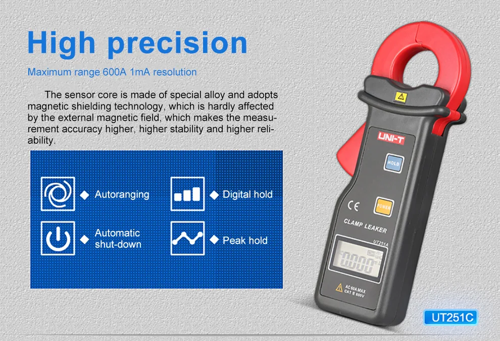 Высокочувствительные токовые клещи UT251 серии с высокой чувствительностью предназначены для тестирования тока утечки переменного тока. Эти Счетчики высокого разрешения отлично подходят для таких применений, как проверка тока утечки двигателя, бытовой техники и другого электрического оборудования до 600а.