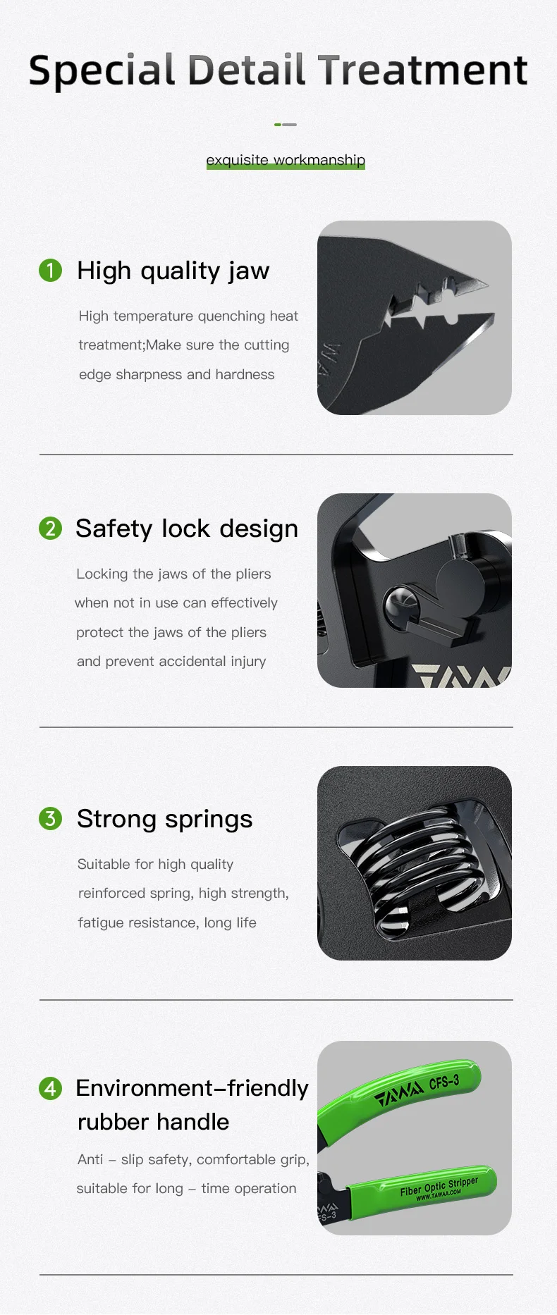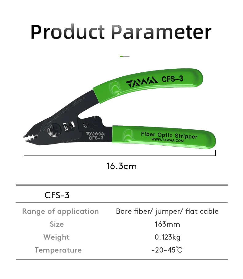 Устройство для зачистки CFS-3 волокна имеет 3-отверстие, которое подходит для зачистки свободной трубки 125 мкм-3 мм, голеного волокна и обшитого кабеля. Челюсти обработаны медленной проволокой и высокотемпературным закаливанием, что не повредит волокно, сохранит волокно и оставит его. Ручка разработана с термопластичной эластичностью, которая имеет эффект нескользящей, и операция более удобна и удобна.