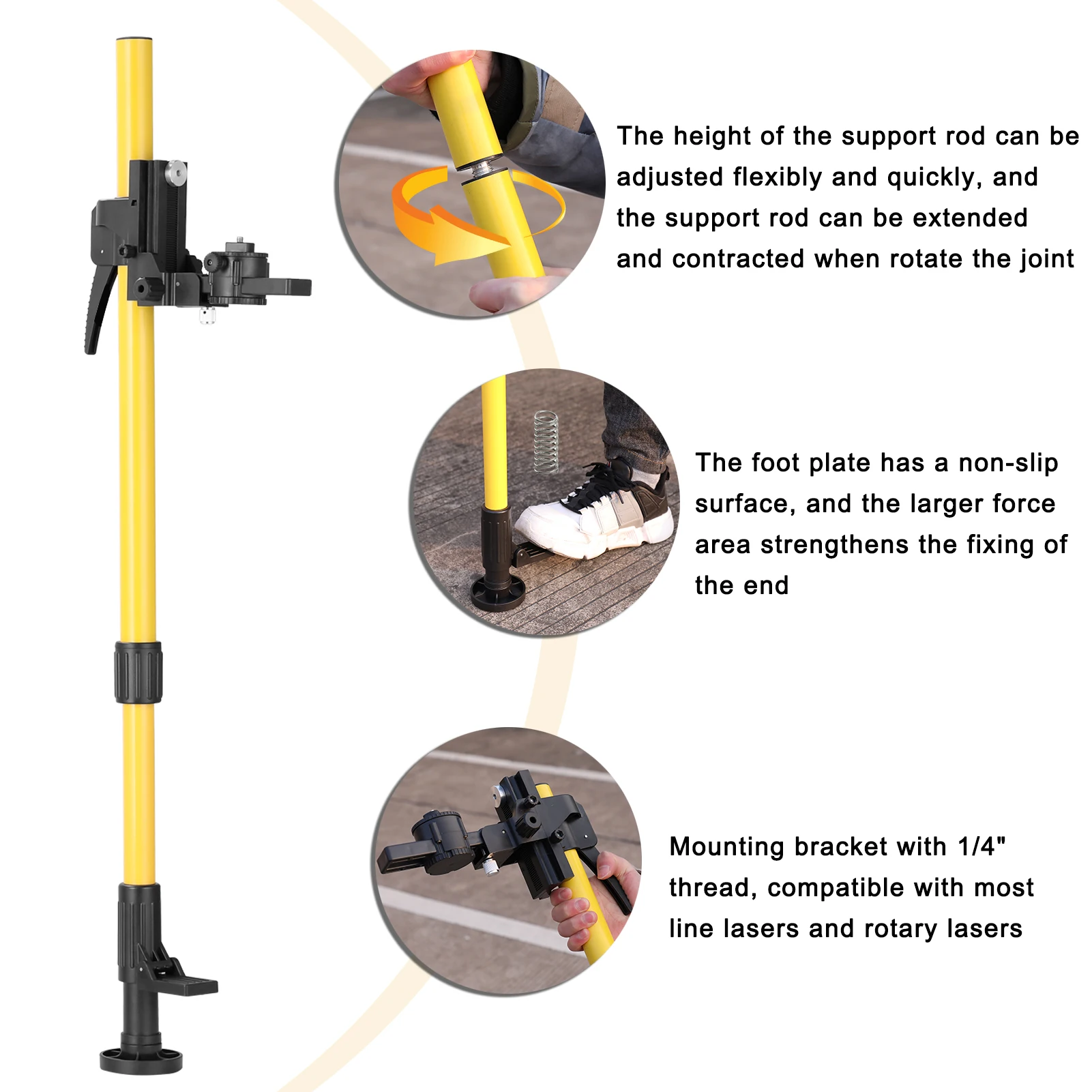 Это своего рода качественный набор кронштейнов лазерного уровня, включая один телескопический стержень, 2 шт. коротких соединительных стержня и 4 шт. длинных соединительных стержней и один кронштейн лазерного уровня. Убираемая высота телескопического стержня составляет 0,755 м, максимальная удлиненная высота-1,233 М. Оснащен лазерной регулировкой высоты, диапазон тонкой настройки 80 мм. Имеется ручка тонкой настройки для регулировки глубины в пределах 42 мм. Монтажный кронштейн с резьбой 1/4 ", совместим с большинством линейных лазеров и вращающихся лазеров.