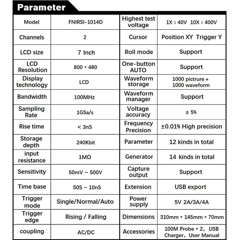 FNIRSI-1014D представляет собой два в одном осциллограф и генератор сигналов, частота дискретизации в реальном времени является 1GSa / s и с 100 МГц * 2 ана-журнал пропускная способность, с 7 дюймовым TFT ЖК-дисплей экран дисплея, встроенный высоковольтный модуль pro-tection может выдерживать Непрерывное напряжение до 400 В, Не беспокоясь о ДТП при сжигании осциллографа, вызванном тем, что зонд не движется к 10x зубчатой передаче, встроенный генератор сигналов функции DDS и выходная мощность ori-ginal (@ 2.5vpp), все шаги частоты сигнала-1 Гц, поддержка 14 видов стандартного функционального сигнала и настраиваемого сигнала, Разделяя выходное устройство, захватывает часть или всю часть сложных сигналов, измеренных осциллографом как выходной сигнал генератора сигнала, который может хранить до 1000 индивидуальных сигналов отключения. Приходите и попробуйте, это не подведет вас.