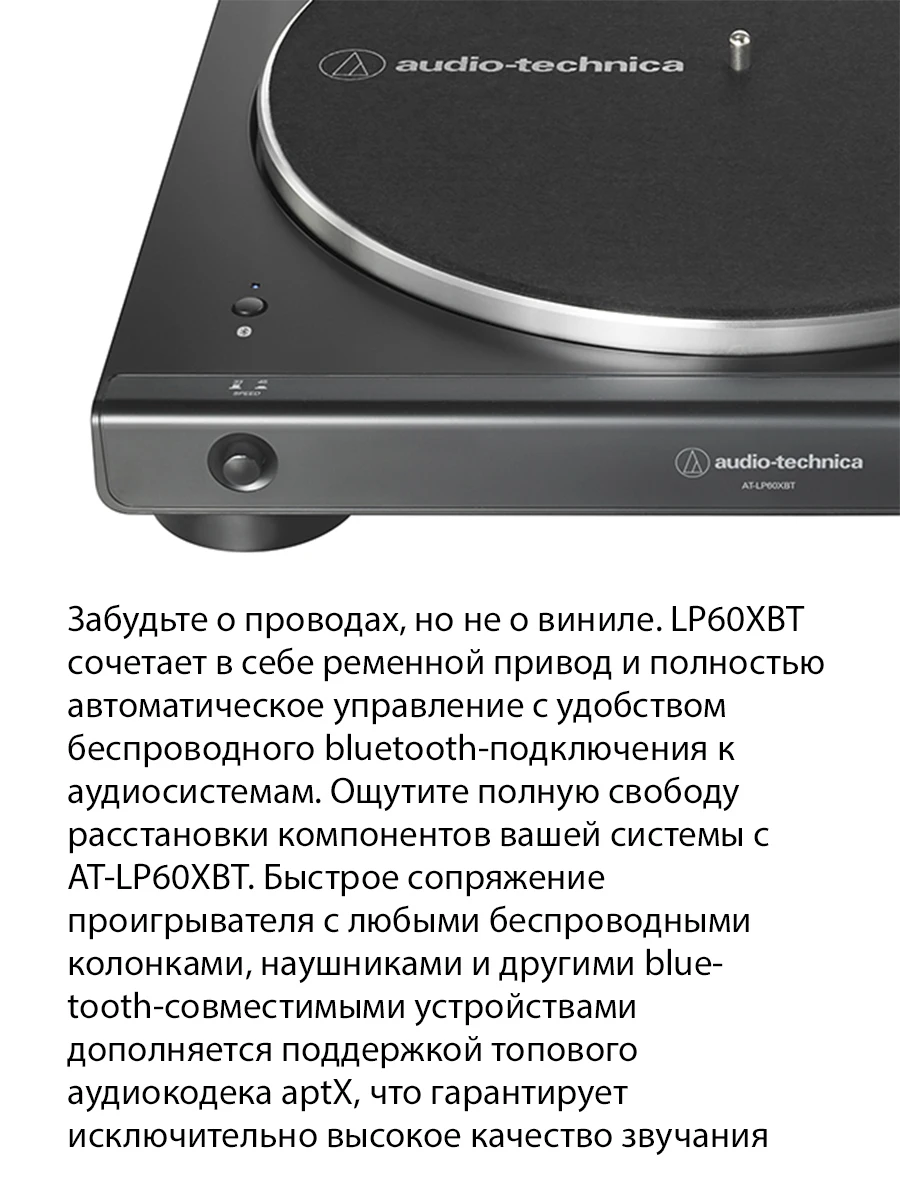 Забудьте о проводах, но не о виниле. LP60XBT сочетает в себе ременной привод и полностью автоматическое управление с удобством беспроводного bluetooth-подключения к аудиосистемам. Ощутите полную свободу расстановки компонентов вашей системы с AT-LP60XBT. Быстрое сопряжение проигрывателя с любыми беспроводными колонками, наушниками и другими bluetooth-совместимыми устройствами дополняется поддержкой топового аудиокодека aptX, что гарантирует исключительно высокое качество звучания.