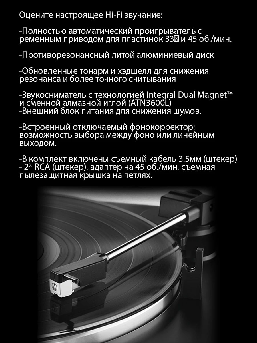 Начните свой путь в мир Hi-Fi звучания с нашим новым виниловым проигрывателем AT-LP60X-USB, оснащенным ременным приводом и полностью автоматическим управлением. Прогрыватель поддерживает воспроизведение на скорости 33 1/3 и 45 об./мин. Встроенный USB-разъем позволит вам подсоединить AT-LP60XUSB к компьютеру и сохранить фонотеку в цифровом виде. Просто установите на свой ПК или Mac необходимое ПО - и все готово к оцифровке ваших любимых записей. Помимо USB-разъема проигрыватель оснащен двумя разъемами RCA для проводного подключения (кабель в комплекте) и встроенным фонокорректором. Начните наслаждаться любимой музкой сразу после распаковки!