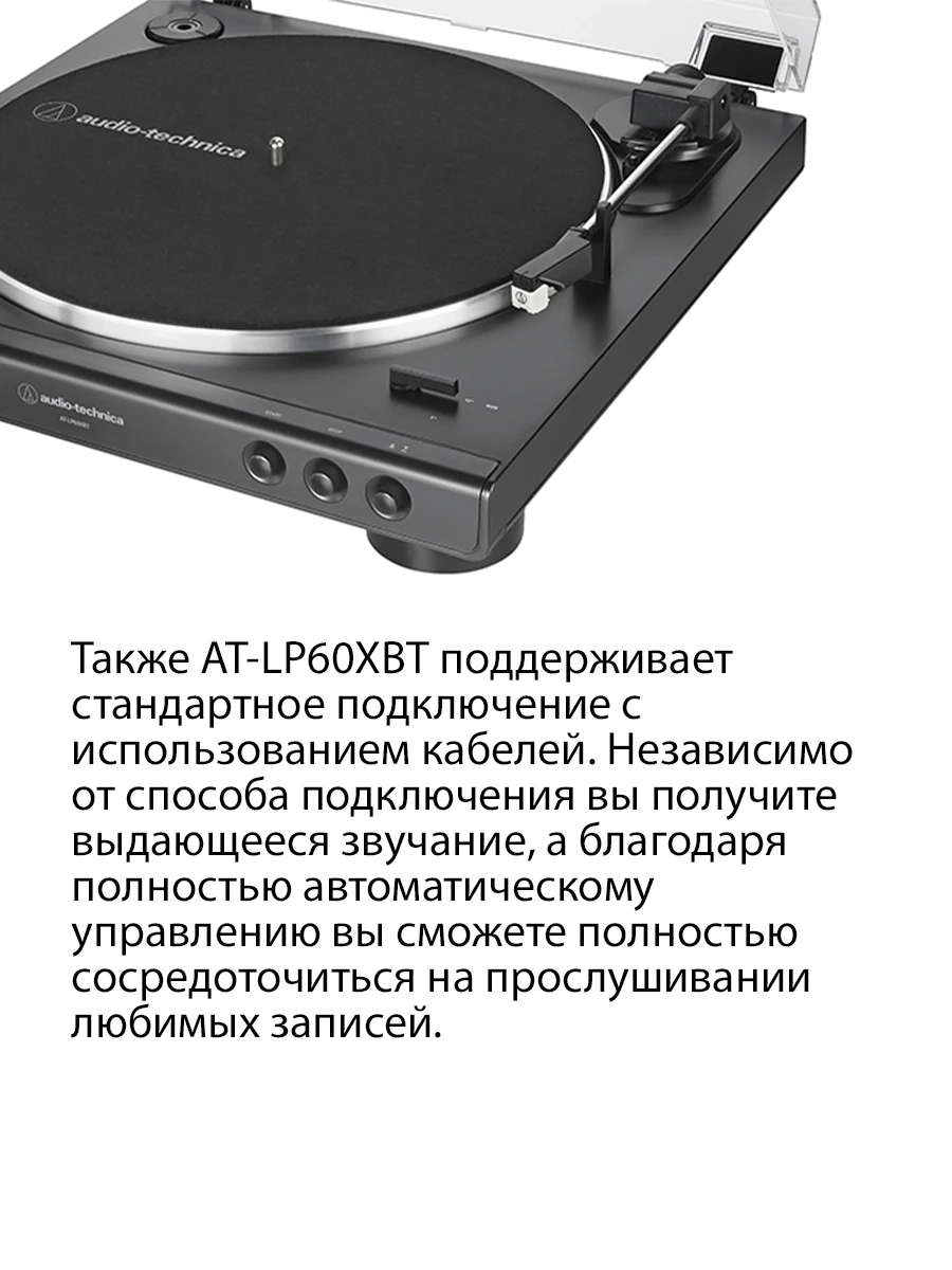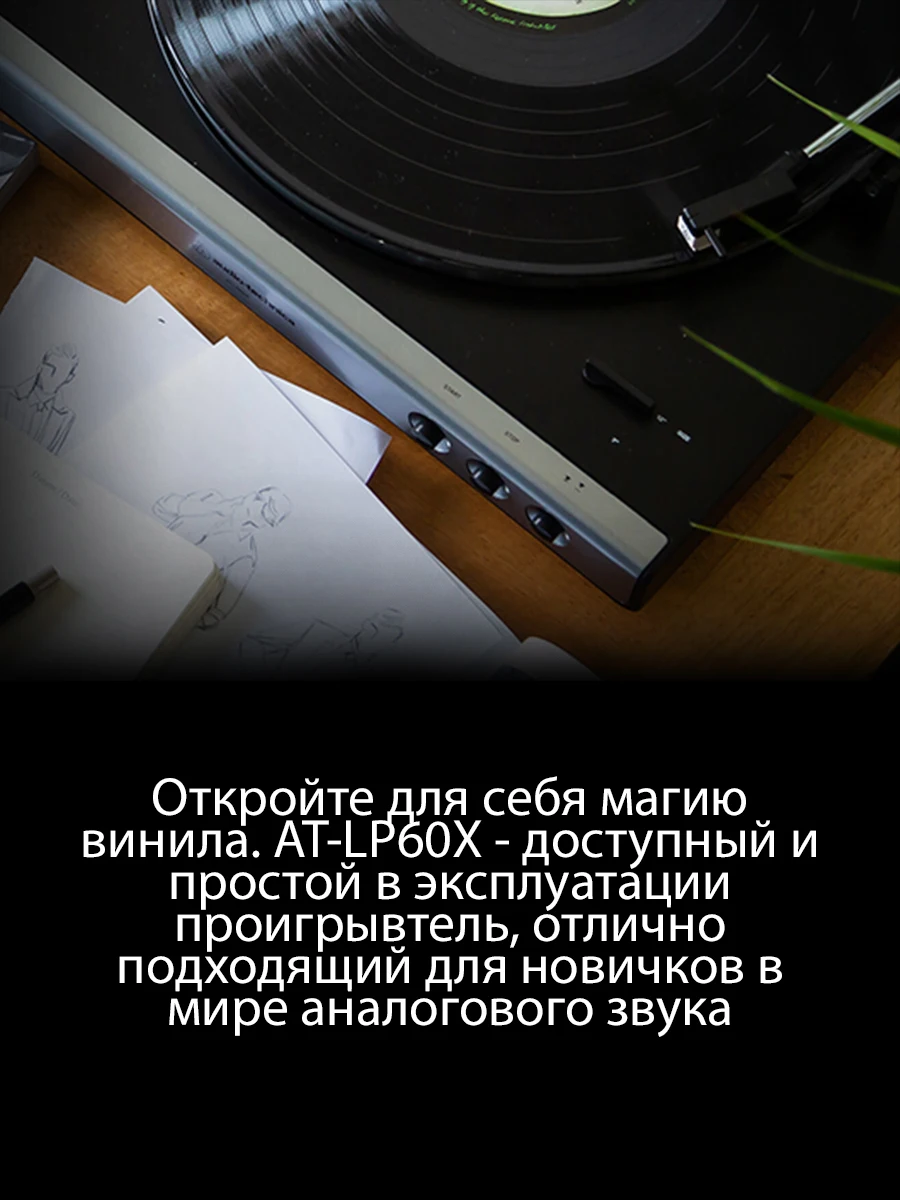 AT-LP60XЕсли вы хотите послушать давно забытую коллекцию пластинок или просто хотите дополнить вашу аудиосистему виниловым проигрывателем - полностью автоматический AT-LP60X станет прекрасным выбором.Ваш входной билет в мир винилаОткройте для себя магию винила. AT-LP60X - доступный и простой в эксплуатации проигрыватель, отлично подходящий для новичков в мире аналогового звука.