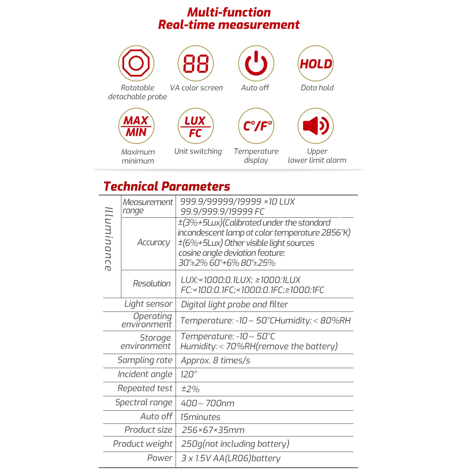 Wide Measurement Range: with wide measuring range up to 200000LUX, 0.1Lux/0.1FC high display resolution, Lux or FC unit switchable.