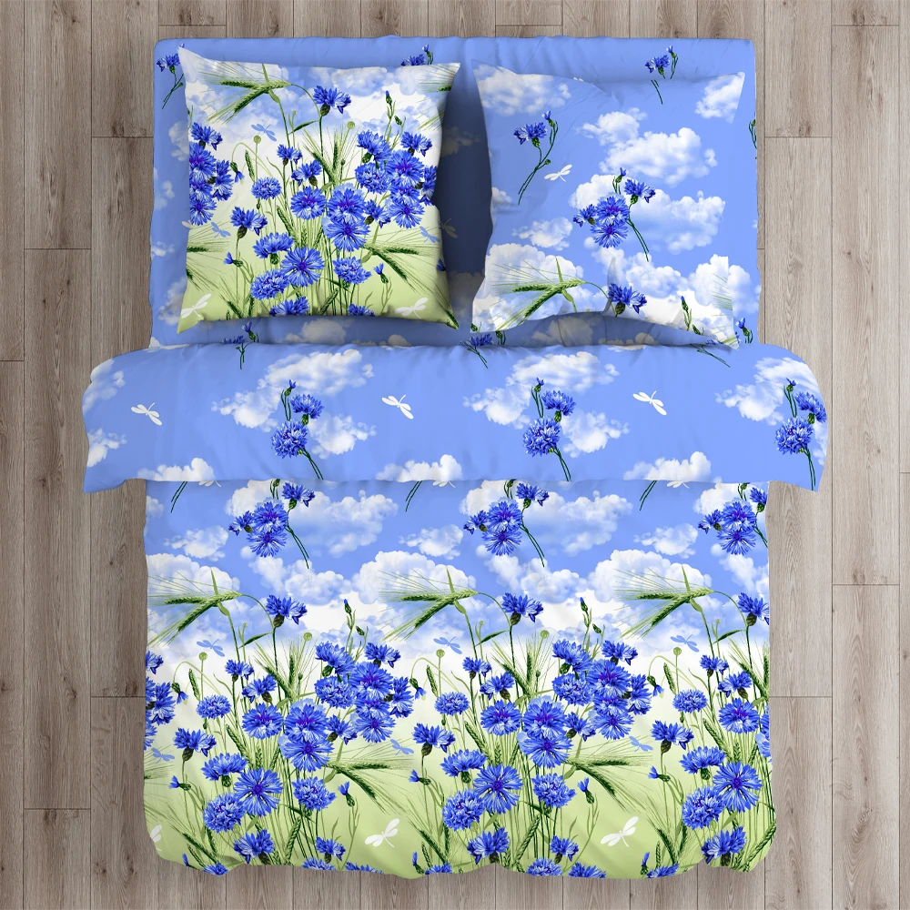 Постельное белье «Василиса»-свежесть русского поля, цветение василька, Нежные оттенки неба и лета, которые не заканчиваются. Постельное белье изготовлено из 100%-хлопковой ткани бязь средней плотности 120 гр. Натуральный хлопок является абсолютно экологически чистым, не вызывает аллергии, хорошо пропускает воздух, позволяя телу дышать. Соблюдая рекомендации по уходу, ткань легко стирается, не садится и практически не мнется, позволяя гладить белье без парения. В то же время ткань остается мягкой и нежной благодаря инновационной системе мягкой ткани, в которой изделие придает гладкую матовую поверхность и улучшает тактильные ощущения. Способ крепления наволочки-клапан шириной 25 см, что очень удобно, при использовании наволочки не открывается, пододеяльник-это отверстие без застежки по краю и красивая современная упаковка в качестве неотъемлемой части подарка для вас и ваших близких, Приносит радость и чувство ожидания.