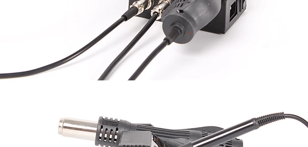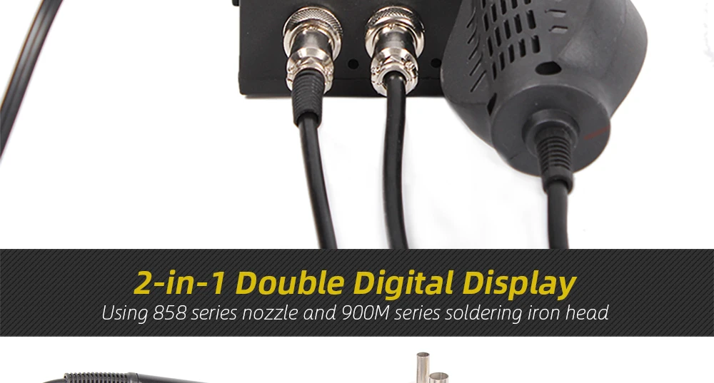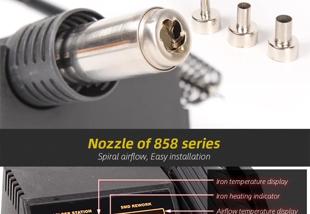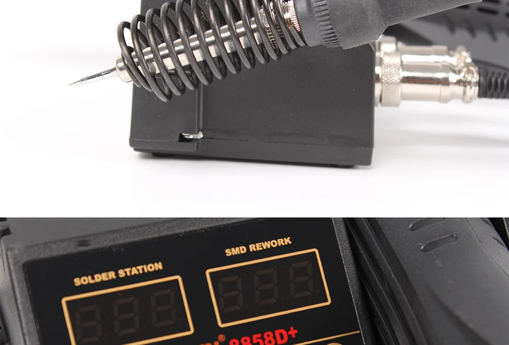 Это совершенно новая паяльная станция 2 в 1 SMD 8858DP. Металлический корпус из сплава с высококачественным силиконовым корпусом отличается элегантным внешним видом и энергосбережением. Вы можете использовать пистолет горячего воздуха и паяльник отдельно, без помех друг с другом.