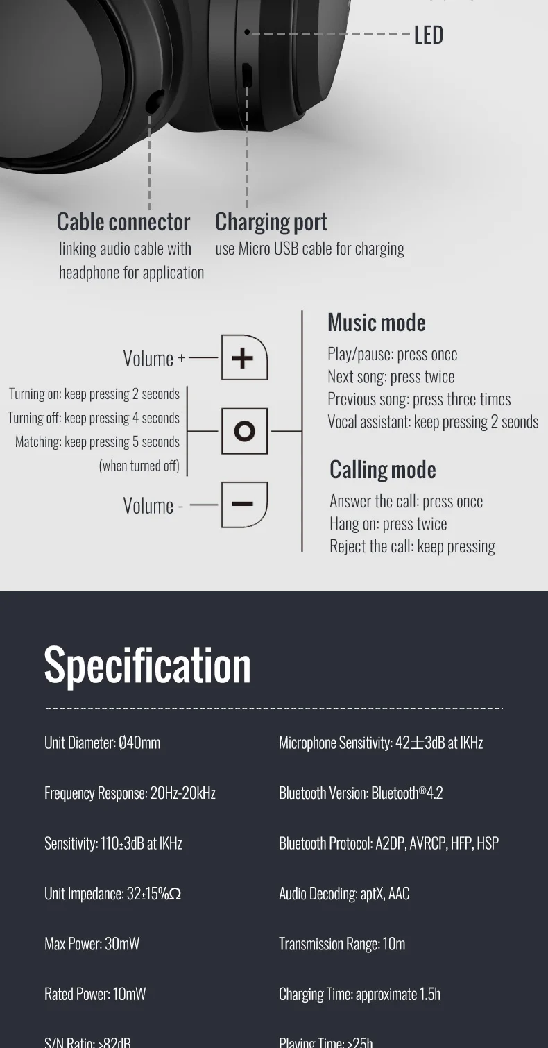 • Разработан с помощью Bluetooth®4,2, надежная передача, высокая защита от помех