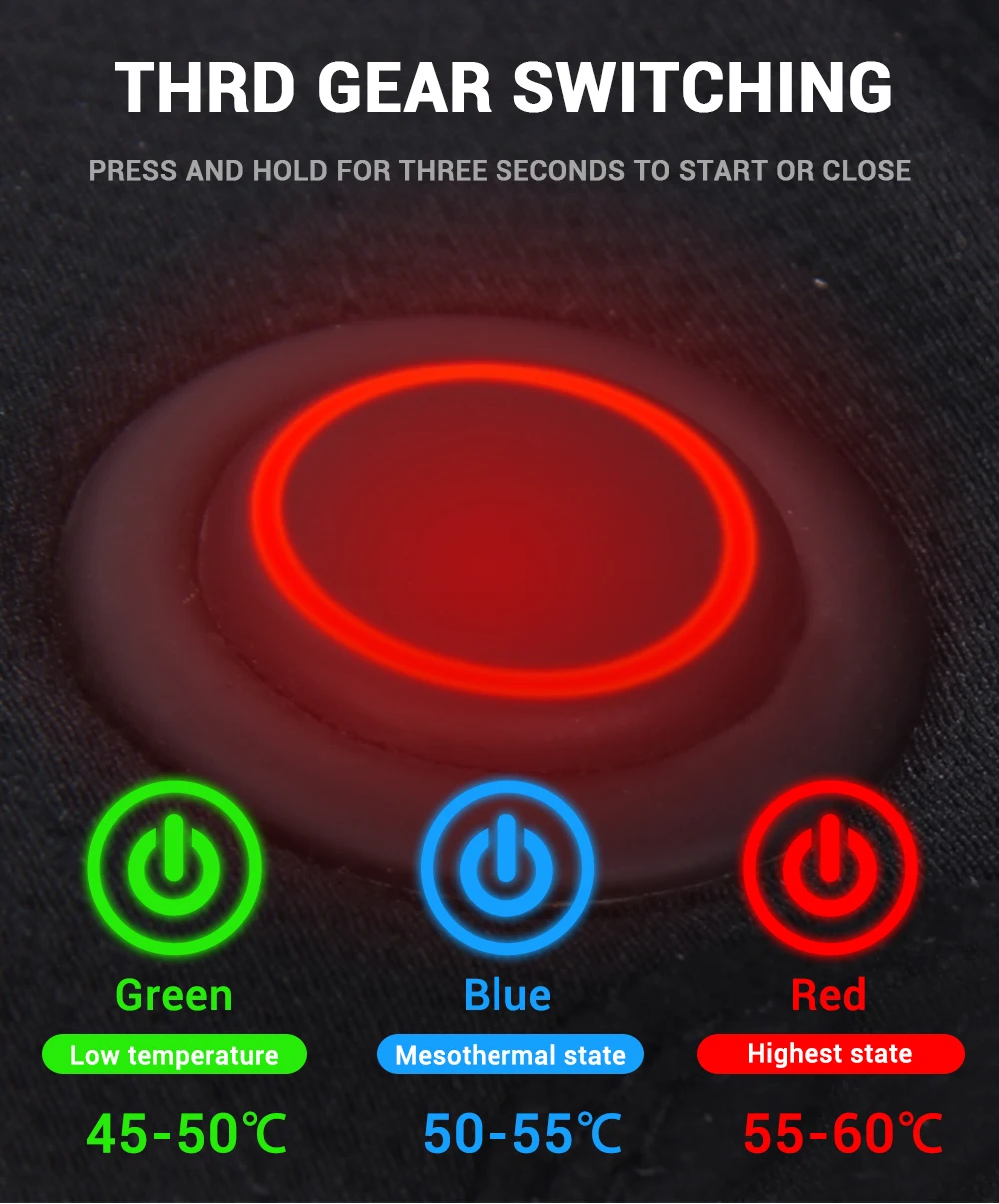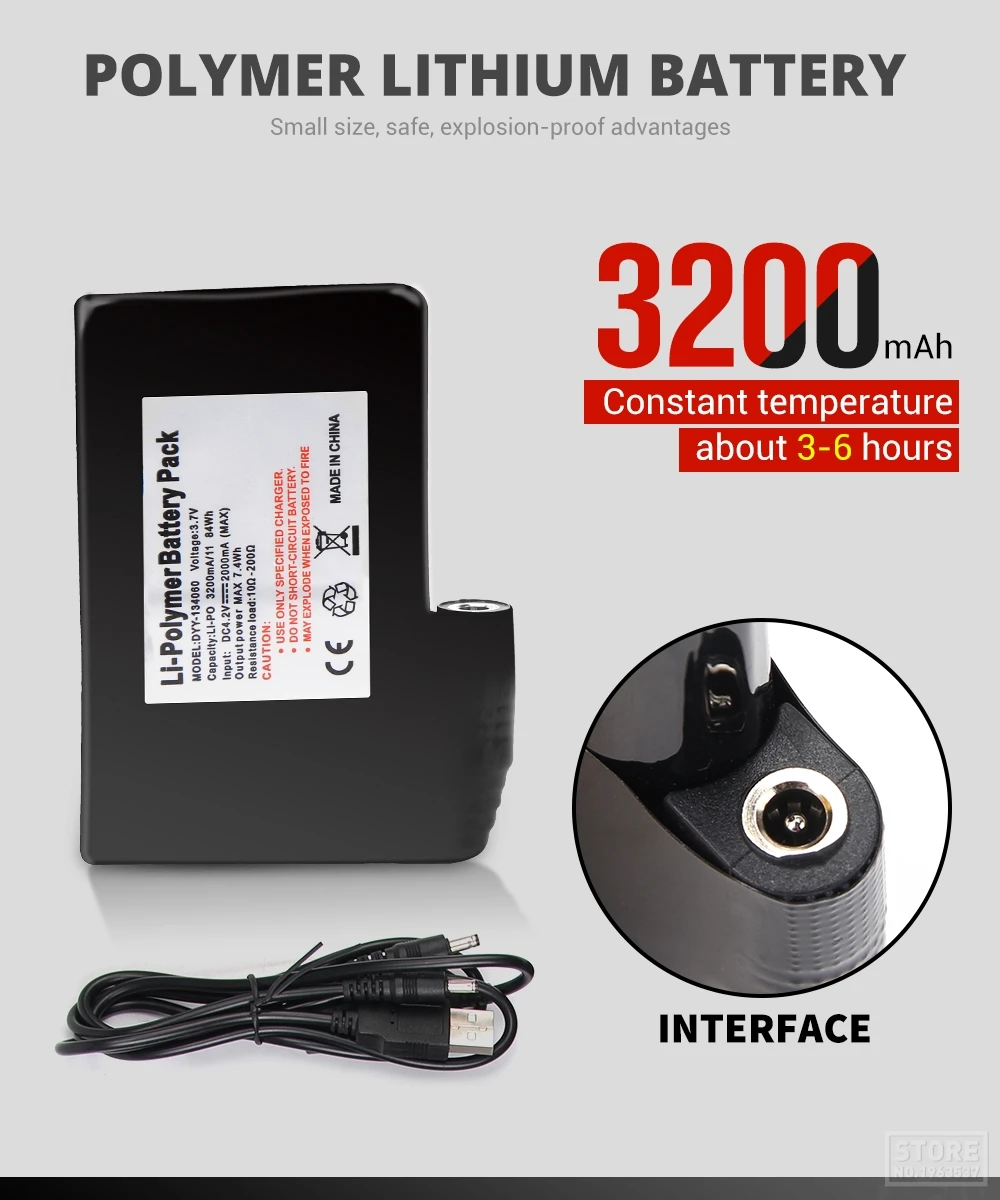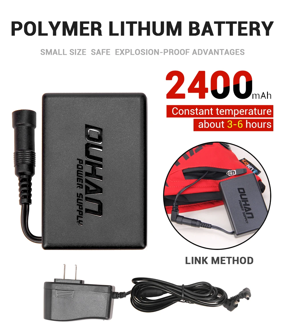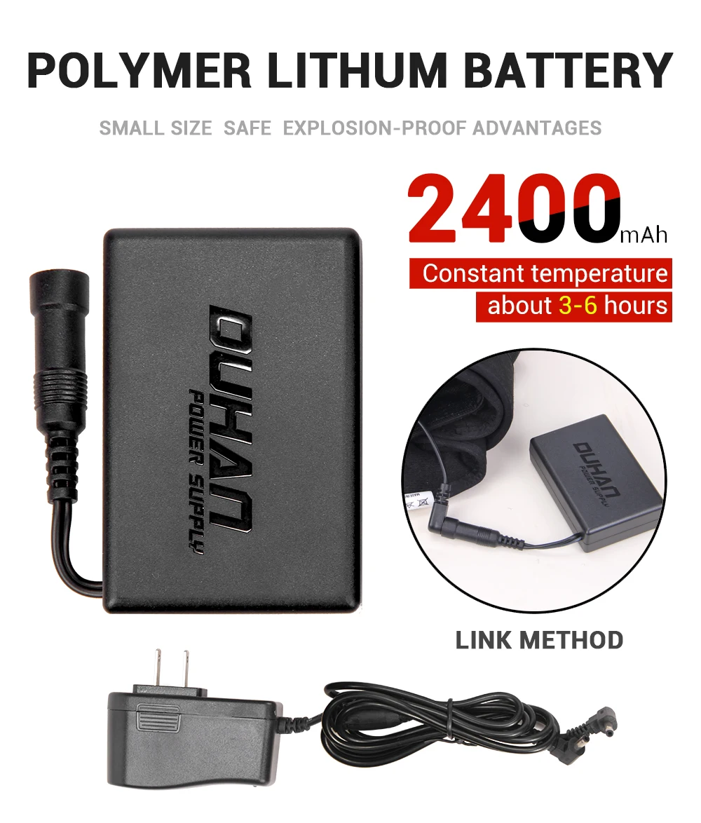 3. Три уровня нагрева, быстро нагреваются, и вы можете почувствовать температуру за 30 секунд. В набор входят 2 высокого качества литиевые батареи 7,4 V / 2400 мА · ч. Батареи хватает на 4,5-6 часов.