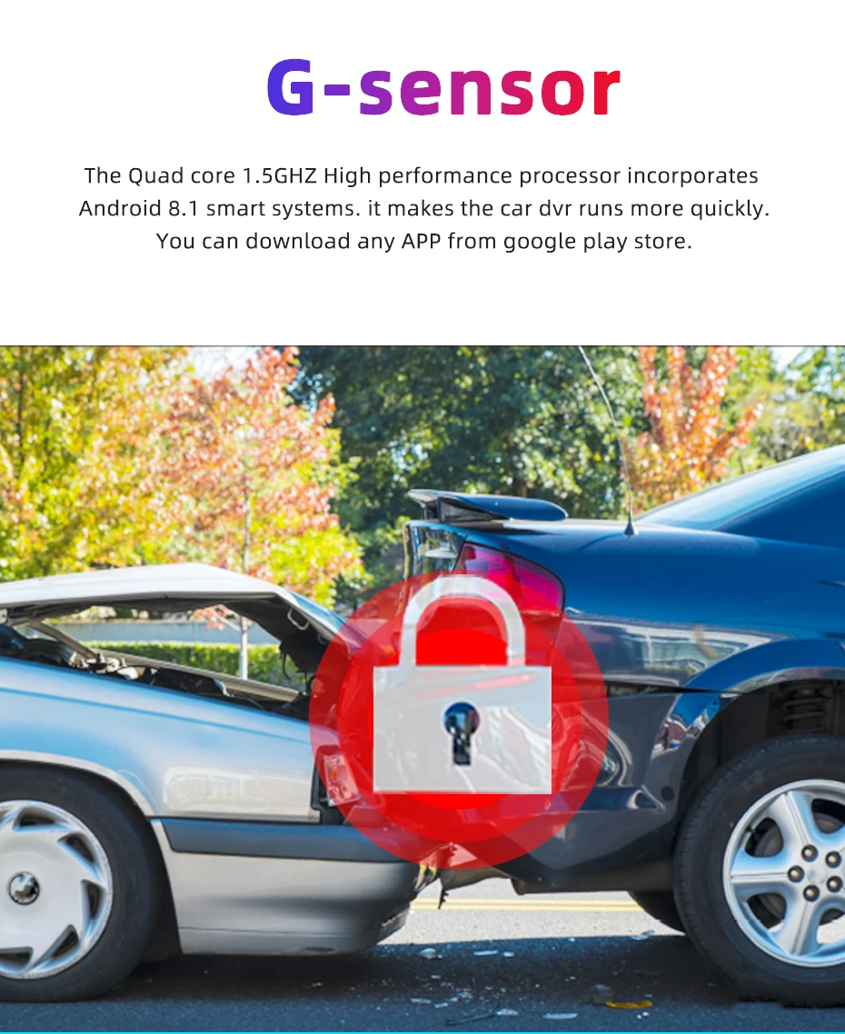 Четырехъядерный 1,4 ГГц высокопроизводительный процессор включает Android 8,1 интеллектуальных систем. Это делает Автомобильный видеорегистратор более быстрым. Вы можете скачать любое приложение из магазина google play.